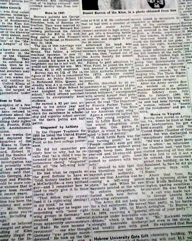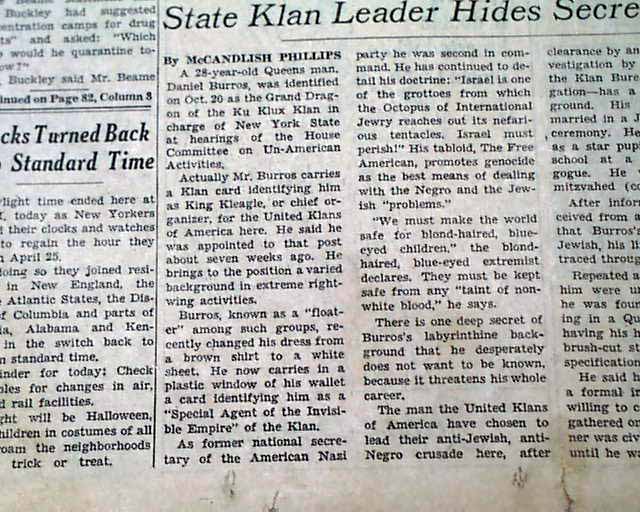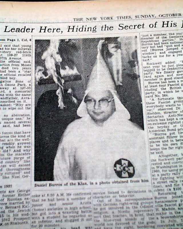 AI notes: Dan Burros was a Jewish American who became infamously involved in extremist hate groups, joining the American Nazi Party and later the Ku Klux Klan’s United Klans of America, despite the fact that both organizations were virulently anti-Semitic. His life embodied a stark contradiction: a man actively participating in movements dedicated to the persecution of people like himself. Burros worked closely with these groups, even holding positions of influence, while keeping his Jewish heritage a secret. In 1965, his double life was exposed by The New York Times, which revealed his background to the public, prompting him to commit suicide shortly afterward. His story is often cited as an extreme example of self-hatred, the psychological complexities behind extremist behavior, and the destructive consequences of hate-driven ideologies.