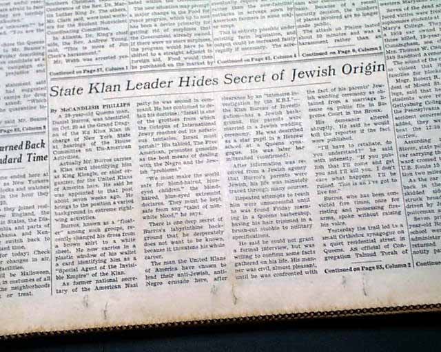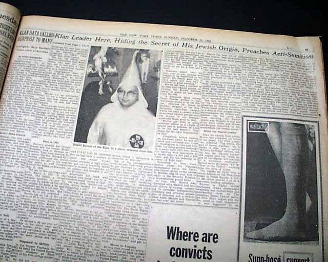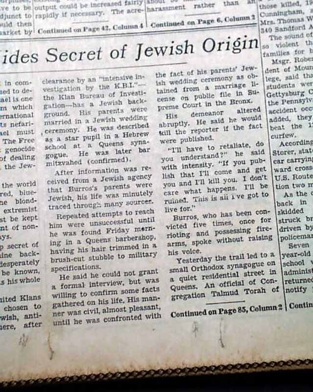 Near the bottom of the front page is a four column heading: "State Klan Leader Hides secret of Jewish Origin" Lengthy report continues inisde with photo. (see images) It was this particular article that drove him to suicide on the same day.