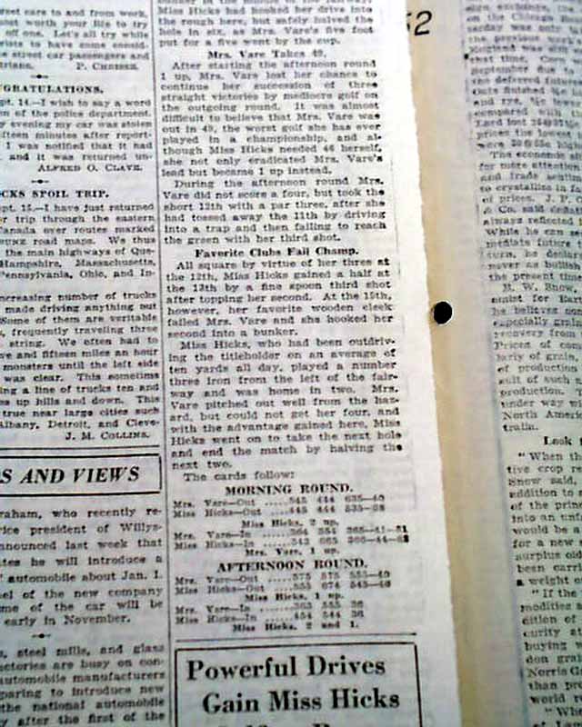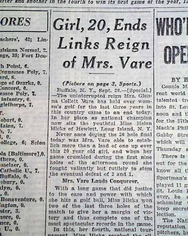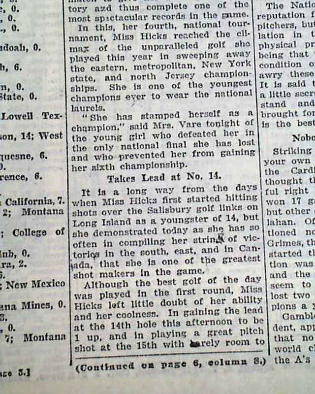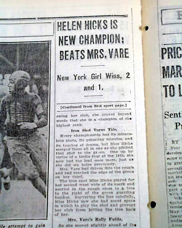The top of the front page of this section has a banner headline: "HELEN HICKS WINS, 2 AND 1; QUEEN OF U.S. GOLF" with subhead. (see images)