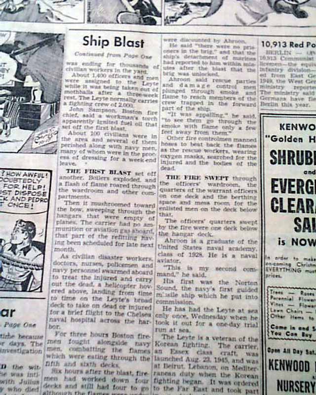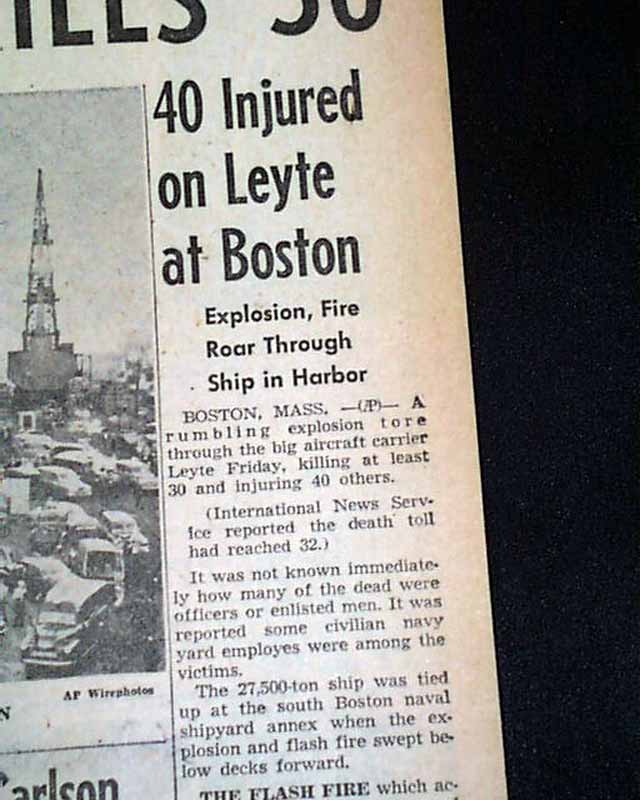 AI notes: On October 16, 1953, the USS Leyte (CV‑32), then undergoing conversion to an anti-submarine aircraft carrier at the Boston Naval Shipyard, suffered a catastrophic explosion in its port catapult machinery room, a compartment beneath the hangar deck. The blast, caused by the accidental ignition of high-pressure hydraulic fluid used in the catapult system, immediately triggered a massive fire that raged for over four hours, belching flames approximately 25 feet above the hangar deck. The disaster claimed the lives of 37 men, including both Navy personnel and civilian workers, and injured 28 others, marking it as one of the deadliest peacetime naval accidents on the Boston waterfront. The ship sustained significant damage, delaying its conversion, but was eventually repaired and returned to service. The incident highlighted the extreme hazards of shipyard work, particularly when dealing with pressurized systems and flammable materials, and remains a largely underrecognized but tragic event in U.S. naval history.