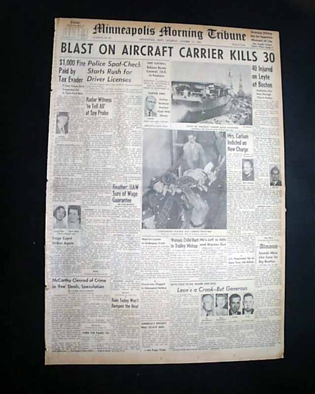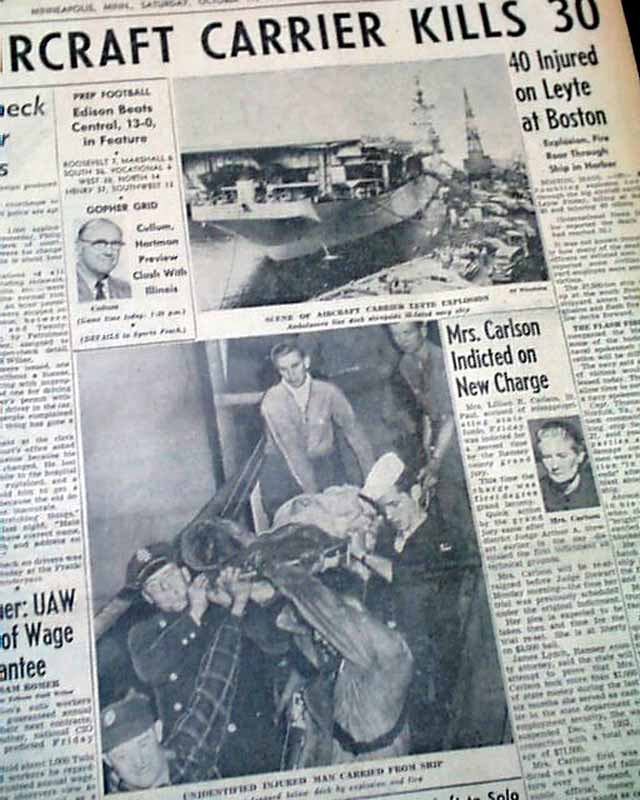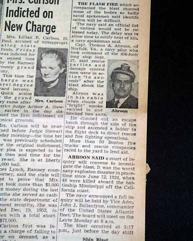 The front page has a banner headline: "BLAST ON AIRCRAFT CARRIER KILLS 30" with subheads and a few related photos. (see images)