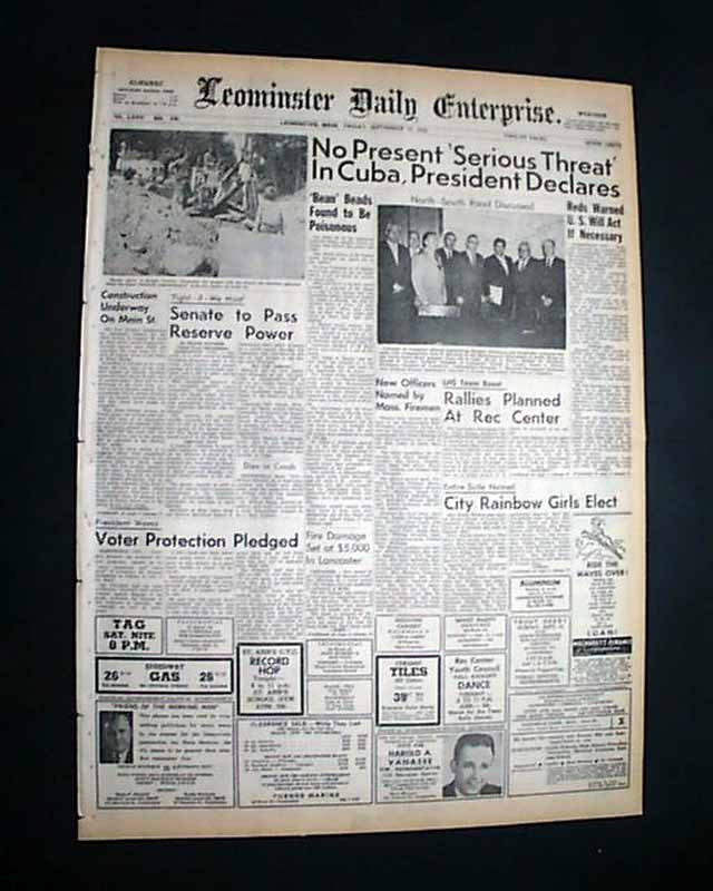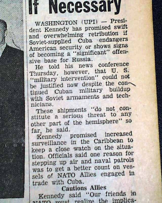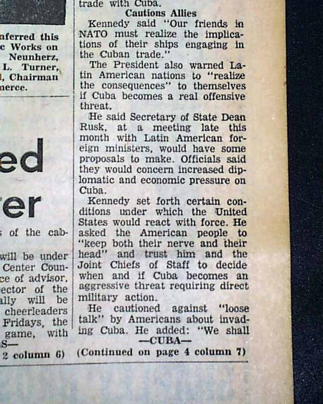 The top of the front page has a five column headline: "No Present 'Serious Threat' In Cuba, President Declares" with subheads. (see images) This was during the initial landings by Soviet troops and their equipment.
