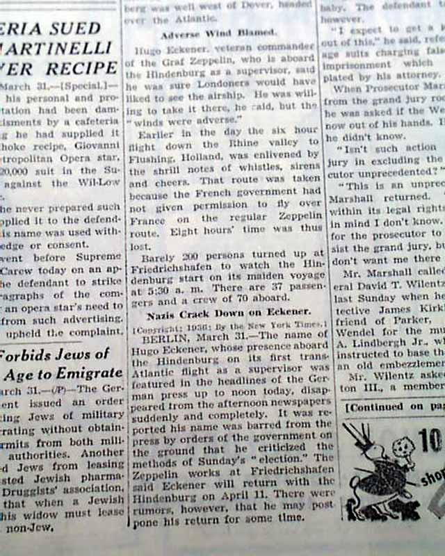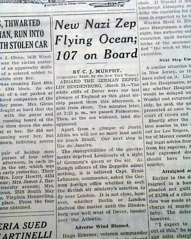 The front page has a one column heading: "New Nazi Zep Flying Ocean; 107 on Board" (see images)