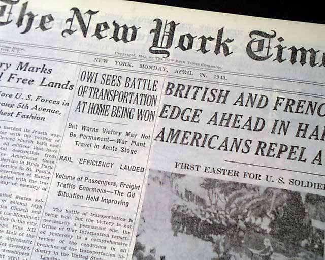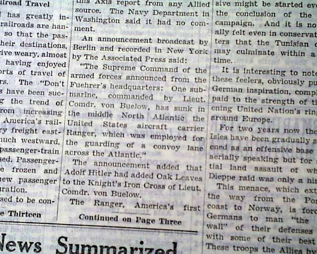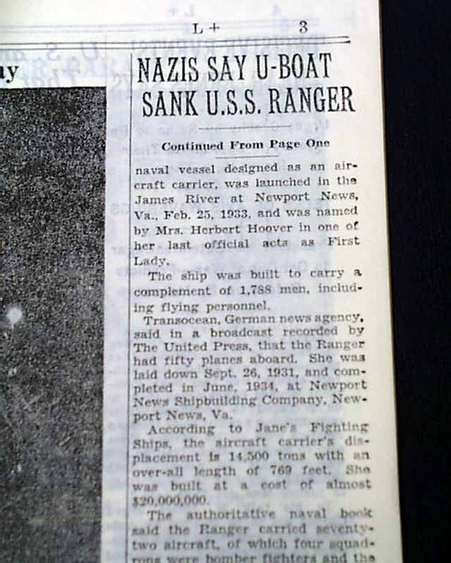 The front page has a one column heading: "NAZIS SAY U-BOAT SANK U.S.S. RANGER" with subhead. (see images)