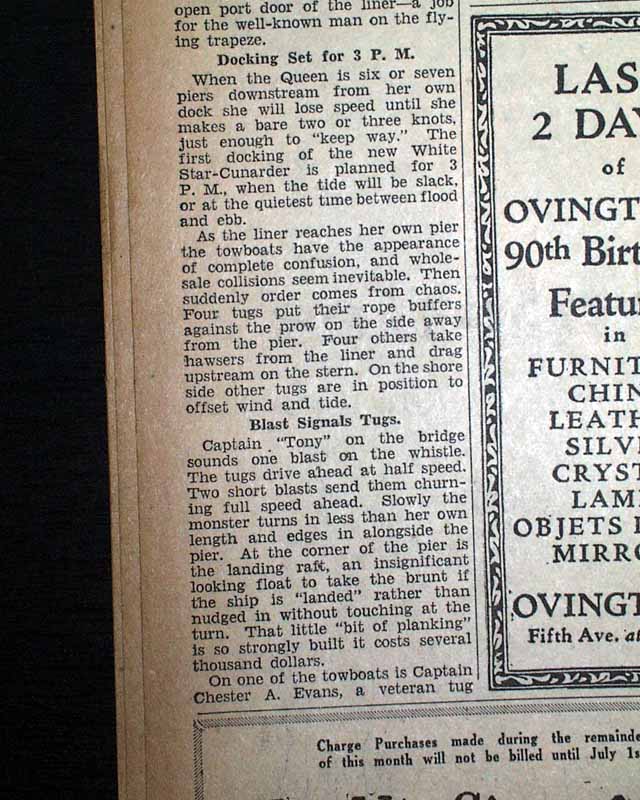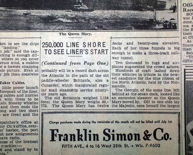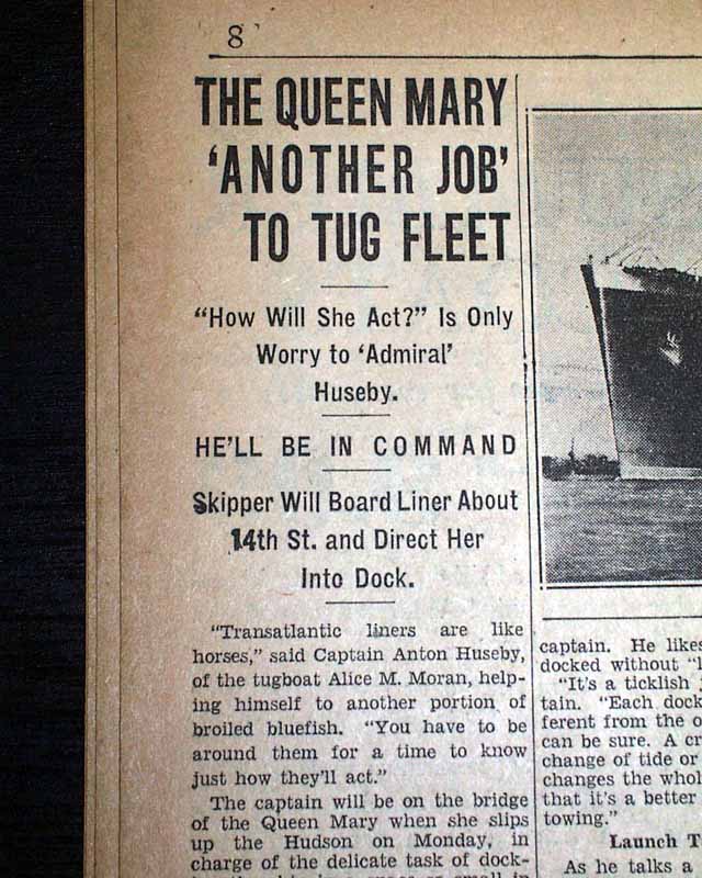 The front page has a one column heading: "S.S. QUEEN MARY HEADS FOR U. S." with subhead. First report coverage continues on page 8 with related photo (see images). Nice to have from the city where she would end her maiden voyage.