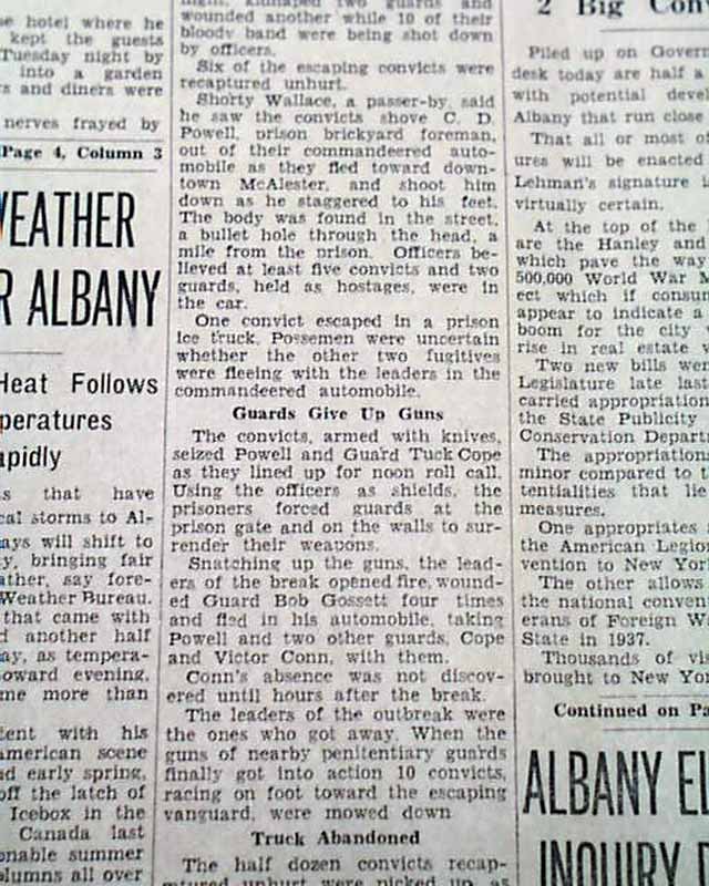 The top of the front page has a one column heading: "1 SLAIN, 11 SHOT IN WILD BREAK BY 24 CONVICTS" with subhead. (see images)