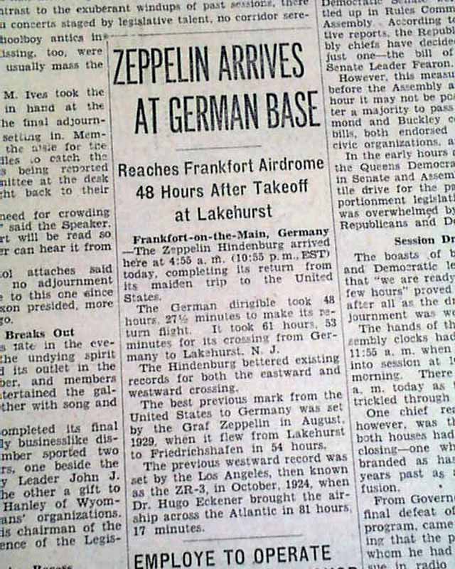 The front page has another one column heading: "ZEPPELIN ARRIVES AT GERMAN BASE" with subhead.