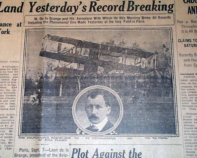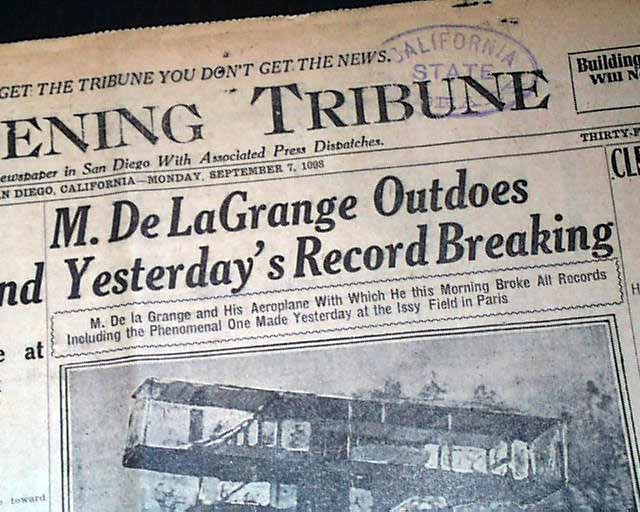 The top of the front page has a four column headline: "M. DeLaGrange Outdoes Yesterday's Record Breaking" with related photo. (see images)