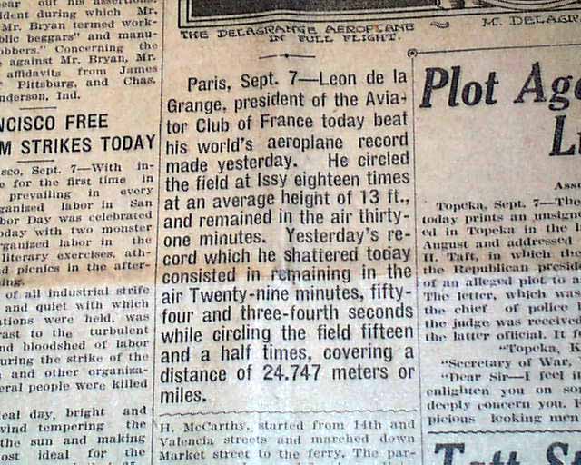 AI notes: On September 7, 1908, French aviator Léon Delagrange made a notable flight at Issy-les-Moulineaux, near Paris, marking one of the early milestones in European aviation. Flying a Voisin biplane, Delagrange covered approximately 15.2 kilometers (about 9.4 miles) in 16 minutes and 30 seconds, setting a new European endurance and distance record at the time. His smooth and controlled flight demonstrated the growing reliability of heavier-than-air machines and helped inspire public enthusiasm for aviation across France. Delagrange, already known as a sculptor turned pioneering aviator, became one of the leading figures of early flight alongside contemporaries like Henri Farman and the Wright brothers.