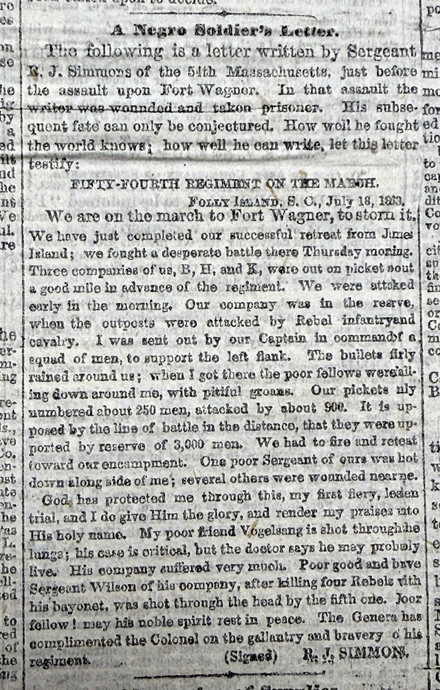 AI notes: In 1863, Robert John Simmons, a Bermudian who served as 1st Sergeant in Company B of the 54th Massachusetts Volunteer Infantry, wrote a vivid letter from Folly Island, South Carolina, describing his regiment’s preparations to assault Fort Wagner, a pivotal Confederate stronghold near Charleston. Dated July 18, the letter recounts a recent skirmish on James Island in which Simmons and roughly 250 men faced a vastly superior enemy force of about 900, describing how “bullets fairly rained around us” yet expressing his faith that God had protected him through this “fiery, leaden trial.” His writing conveys both the immediate dangers of picket duty and the broader emotional weight of combat, reflecting the courage and resolve of African-American soldiers at a time when their valor was often doubted or dismissed. Published later that year in the New York Tribune, Simmons’s letter stands as a rare first-person testimony from a Black soldier during the Civil War, offering insight into the hardships, discipline, and moral conviction that underpinned the service of the 54th Massachusetts, whose assault on Fort Wagner would become a symbol of African-American military heroism and sacrifice.