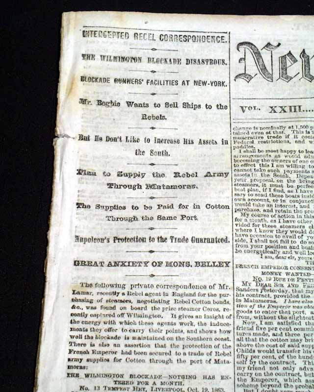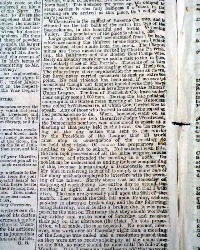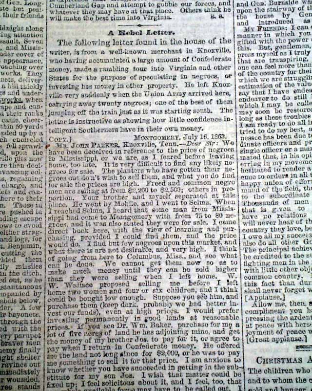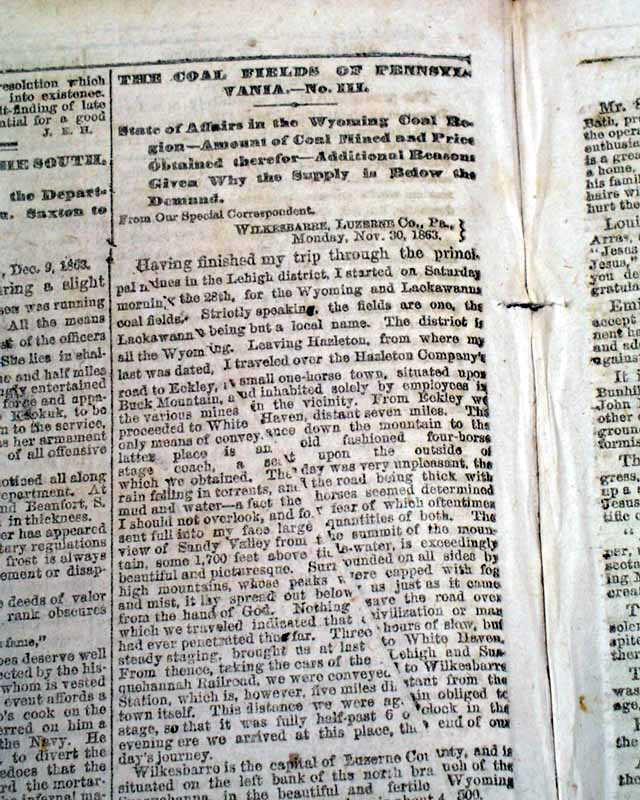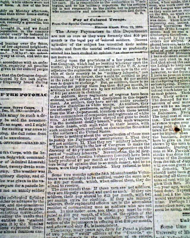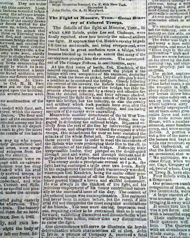 Although the front page--and other pages--have fine reporting on the Civil War, the best content is found on pages 4 and 9. They contain: "A Rebel Letter" from Montgomery, Ala., beginning: "Dear Sir: We have been deceived in reference to the price of negroes in Mississippi...". Also: "The Fight at Moscow, Tenn.--Great Bravery of Colored Troops" "Pay of Colored Troops" and also: "The Coal Fields of Pennsylvania" is a letter from Wilkes Barre.