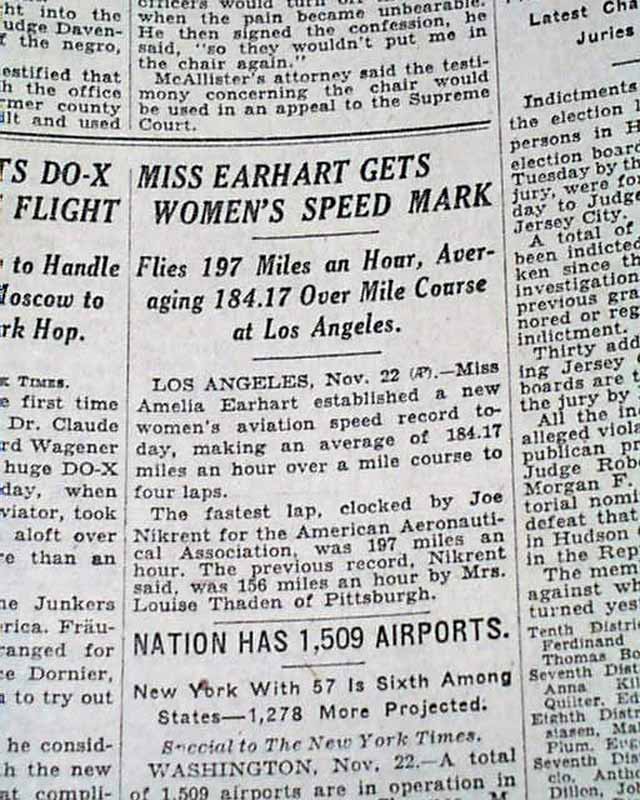 Page 12 has a somewhat discrete report with one column heading: "Miss Earhart Gets Women's Speed Mark" with subhead. (see image)