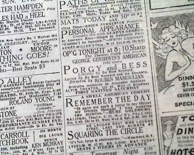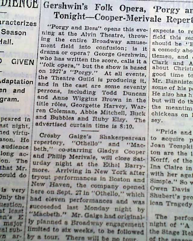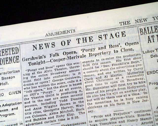 The top of page 30 under "NEWS OF THE STAGE" is a two column heading: "'Gershwin's Folk Opera, 'Porgy and Bess', Opens Tonight..." The same page has a small advertisement for the opera on it's opening night. (see images)