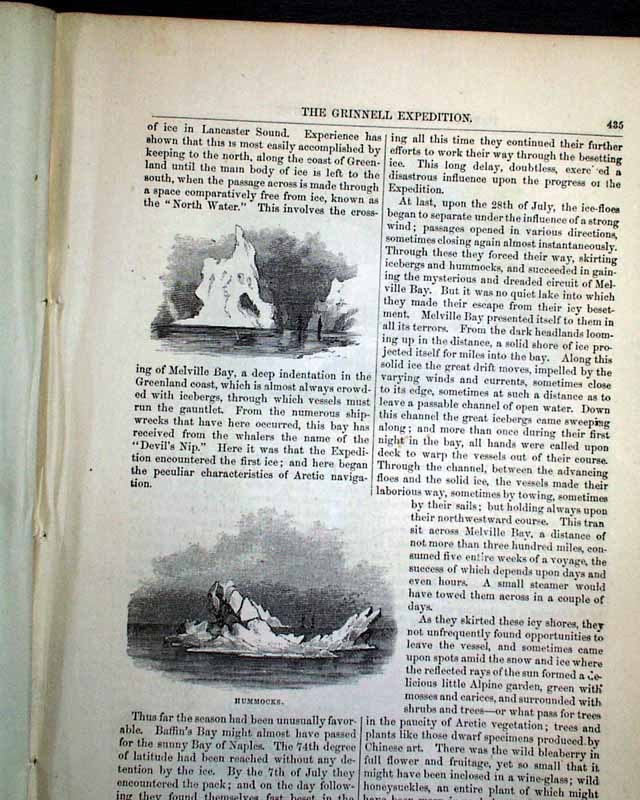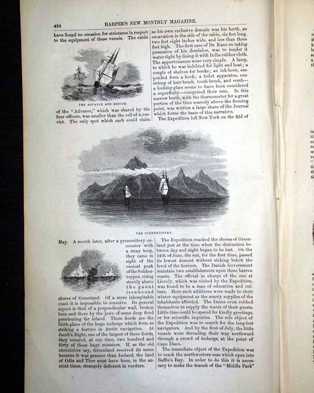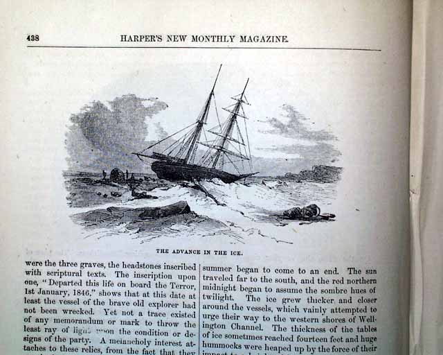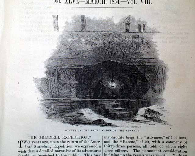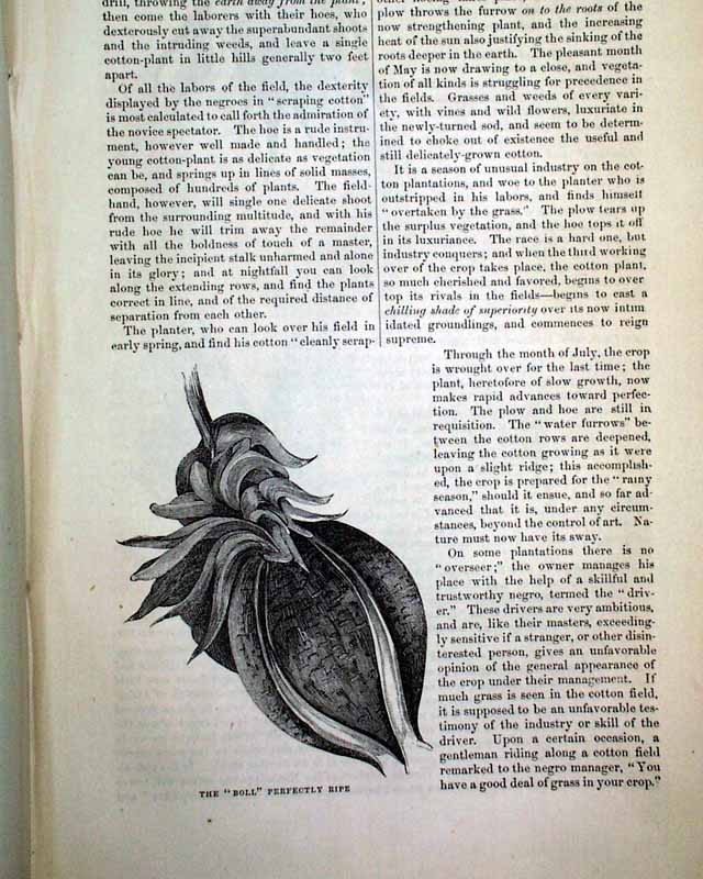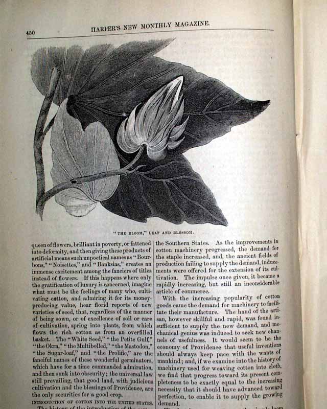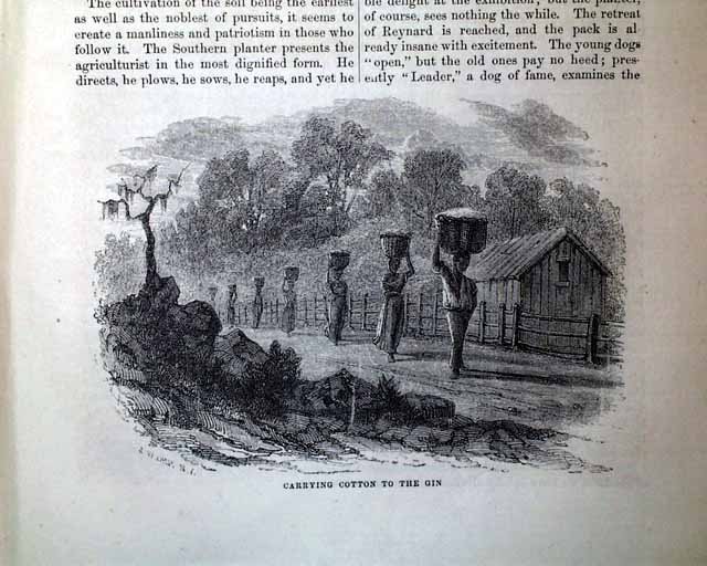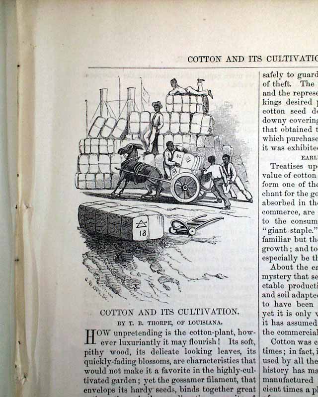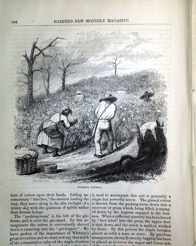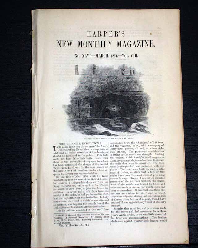 Item # 721484 HARPER'S MONTHLY, New York, March, 1854 Beginning on the ftpg. is a 14 pg. article about the "Grinnell Expedition", which has 29 small illustrations of various scenes of the region: the "Interior of a native hut", the "Inspectors' house at Lievely", "Devil's Thumb", "Melville Bay", and more. Another article, "Cotton and Its Cultivation" (by T.B.Thorpe), includes significant details along with several illustrations related to picking cotton, the cotton-gin, slave labor, etc., and is often cited within other publications for its accurate depiction of the antebellum cotton economy a (slave) labor.