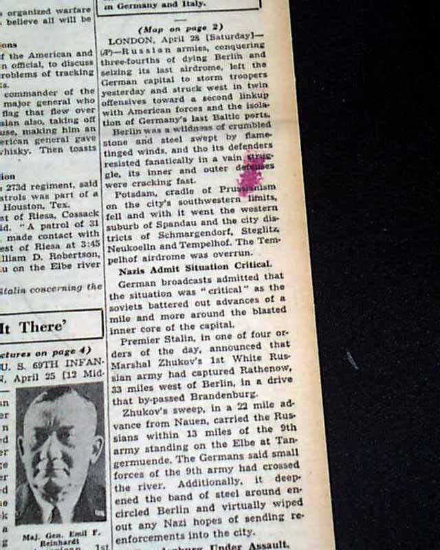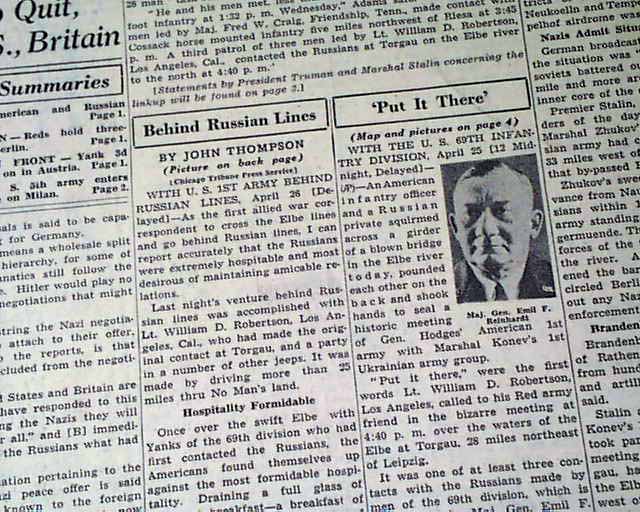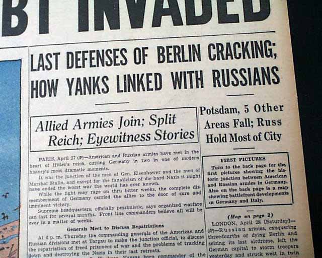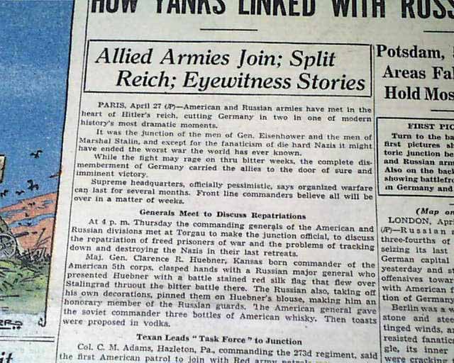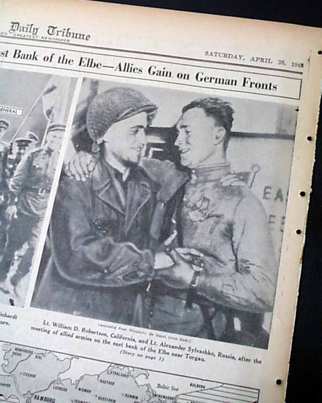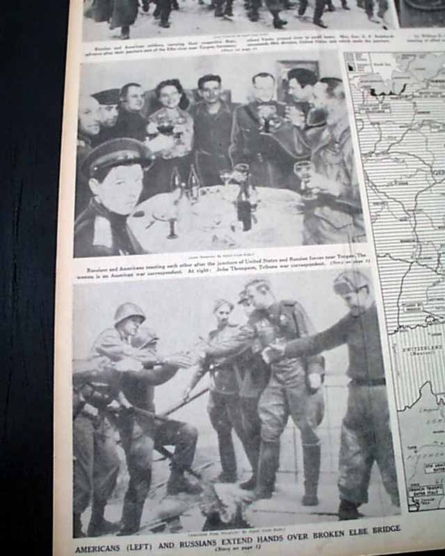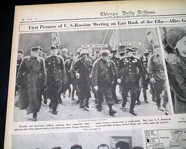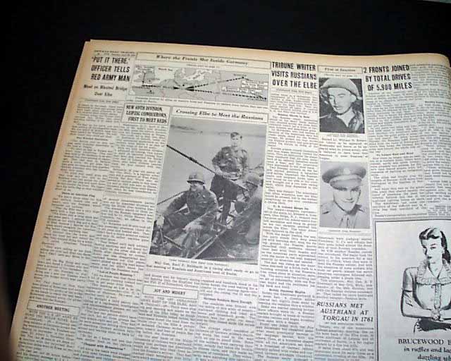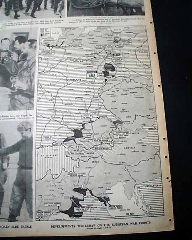 The front page has a three column heading: "HOW YANKS LINKED WITH RUSSIANS" with subheads. More on pages 4 & 5. Four related photos and map are on the back page under banner heading: "First Pictures of U.S.--Russian Meeting on East Bank of the Elbe--Allies Gain on German Fronts" (see images)