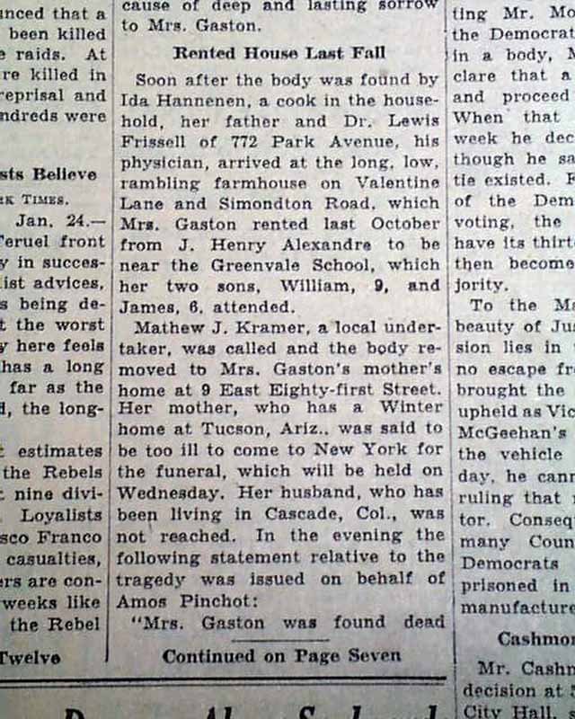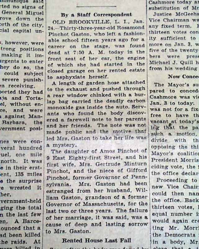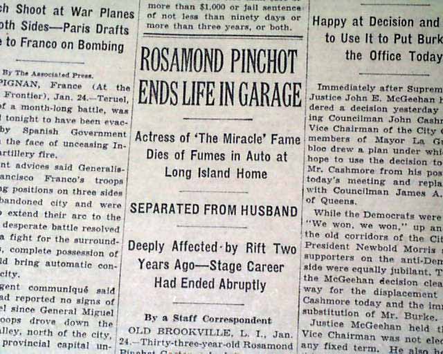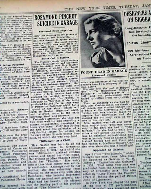 The front page has a one column heading: "ROSAMOND PINCHOT ENDS LIFE IN GARAGE" with subheads. First report coverage continues inside with photo. (see images)