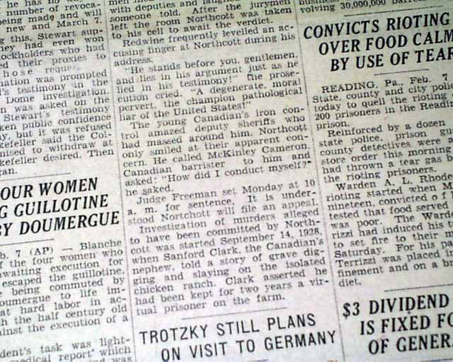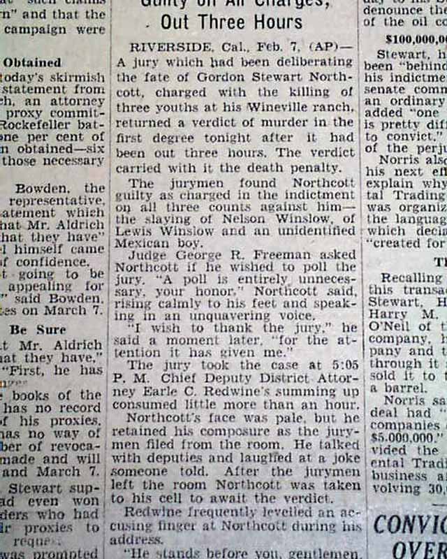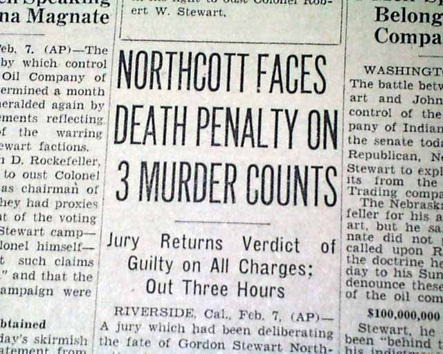 The front page has a one column heading: "NORTHCOTT FACES DEATH PENALTY ON 3 MURDER COUNTS" with subhead. (see images) These murders were featured in the Clint Eastwood movie 'Changeling' starring Angelina Jolie.