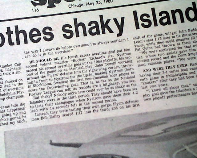 background: On May 24, 1980, the New York Islanders won their first Stanley Cup, defeating the Philadelphia Flyers in Game 6 of the Finals at Nassau Coliseum. The game became one of the most iconic in NHL history when Bob Nystrom scored the championship-winning goal at 7:11 of overtime, finishing a perfect pass from John Tonelli to seal a 5–4 victory. The win marked the beginning of the Islanders’ dynasty, as they would go on to capture four consecutive Stanley Cups (1980–1983), and Nystrom’s overtime goal remains one of the most celebrated moments in franchise history.