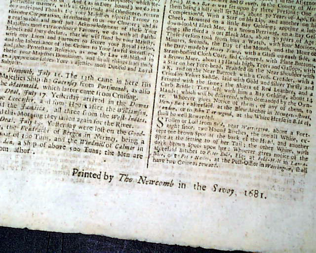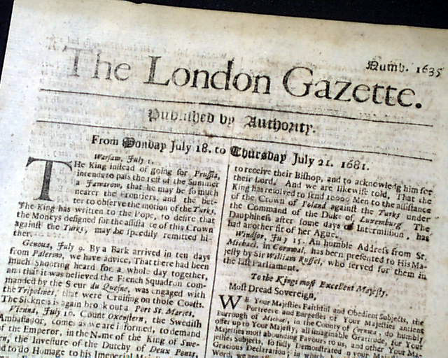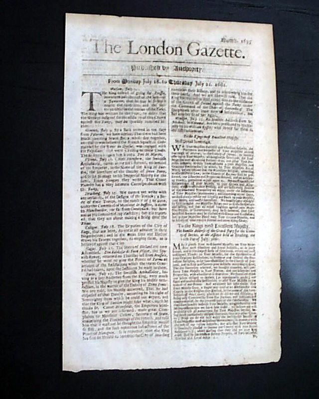 This is the world's oldest continually published English language newspaper, having begun in 1665 and is still printing in London to this day. And this is a very early, genuine issue. As was the case with most newspapers of the 17th century, this is complete as a single sheet, measuring 6 1/2 by 10 3/4 inches and printed on very high quality paper with much cotton & linen fiber content.