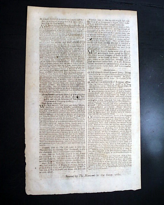 The issue is filled with various news of the day from various cities in Europe, each report with its own dateline, and even includes a few "Advertisements" on the back page. Given its small size this would be a nice newspaper for framing & display with the 344 year old date prominent at the top. Nice condition.