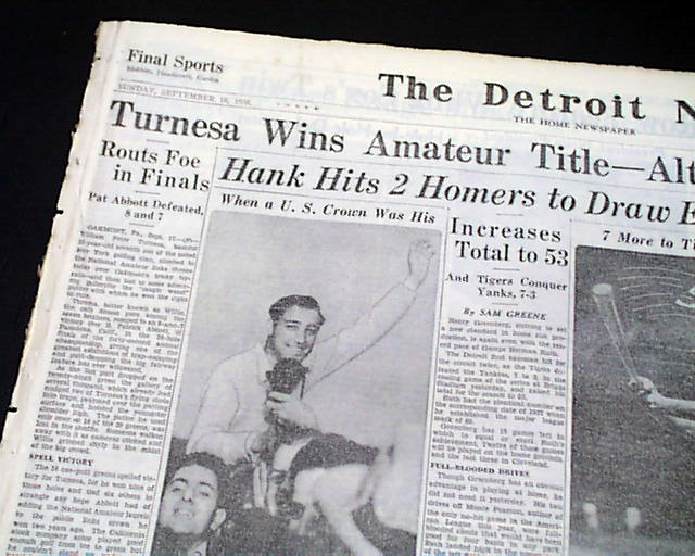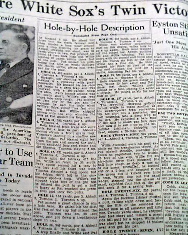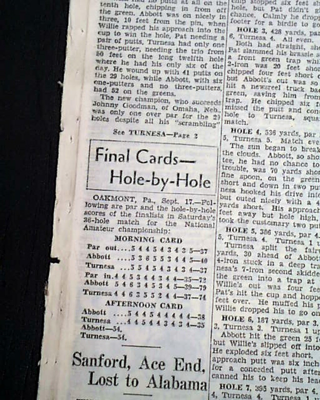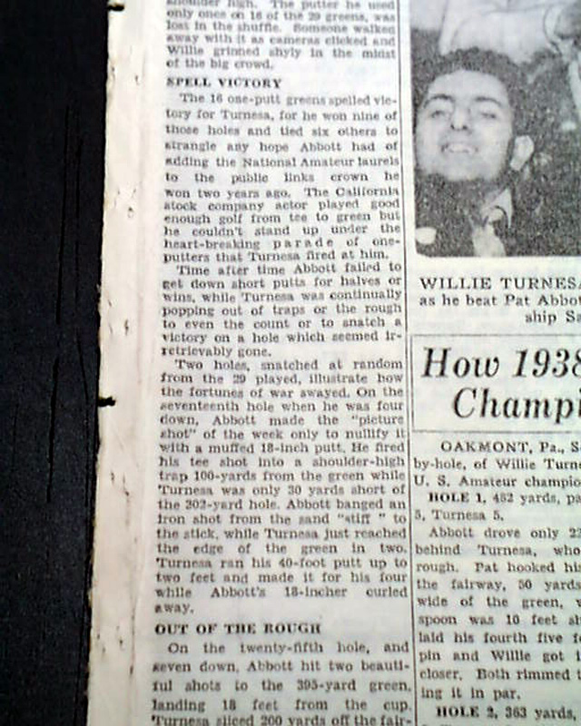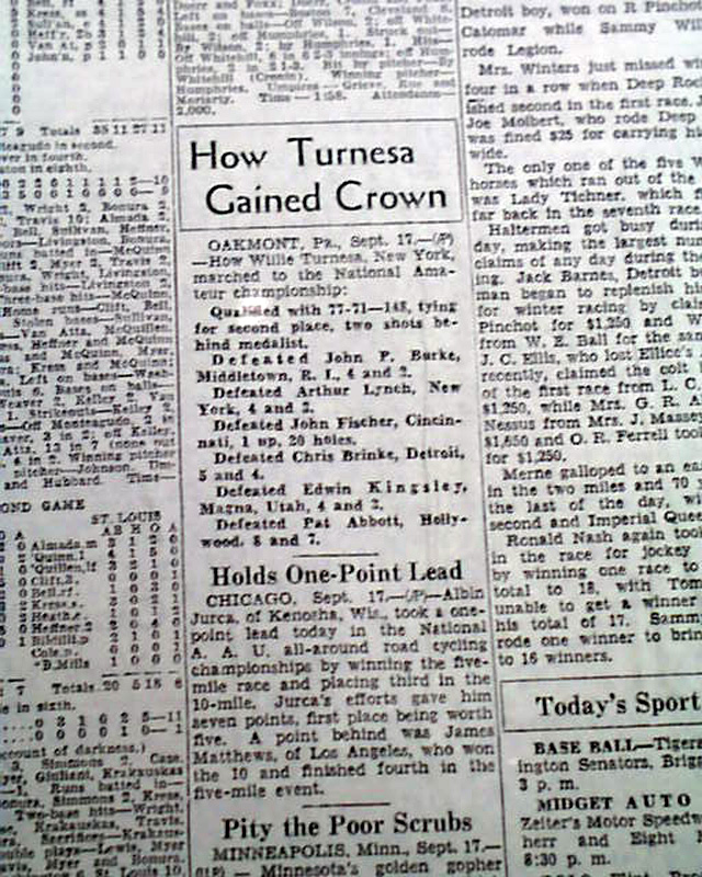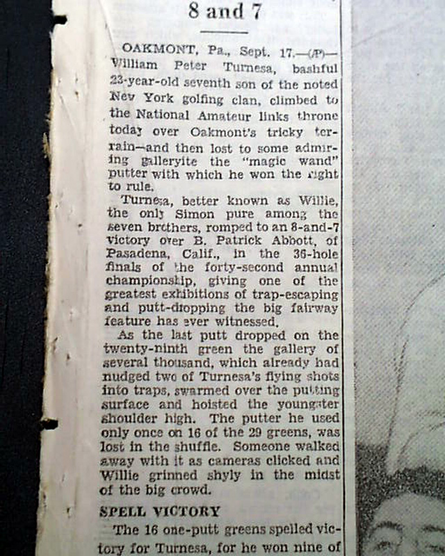 The front page of this section has a four column heading: "Turnesa Wins Amateur Title" with subheads and related photo. (see images)