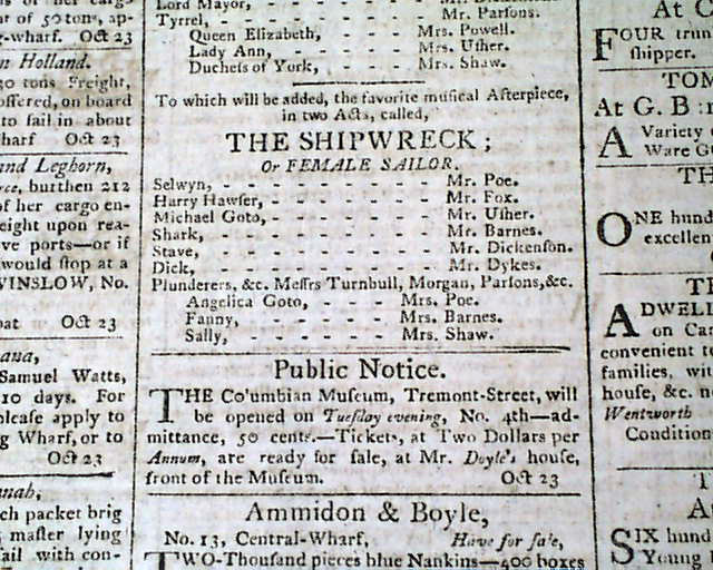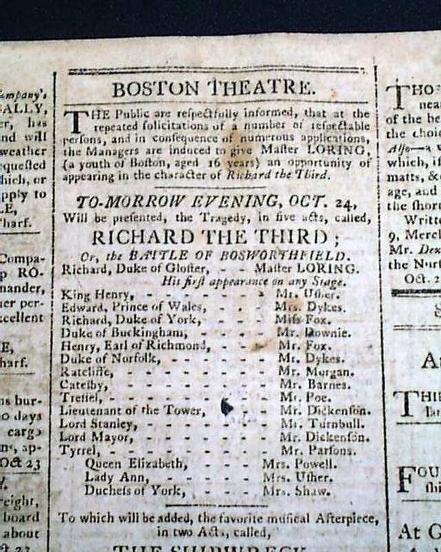 The top of page 3 under "Boston Theatre" is a notice for the performances of "RICHARD THE THIRD", with Mr. Poe as "Tressel" and "THE SHIPWRECK" with Mr. Poe as "Selwyn" and Mrs. Poe as "Angelica Goto" re. the parents of Edgar Allan Poe.