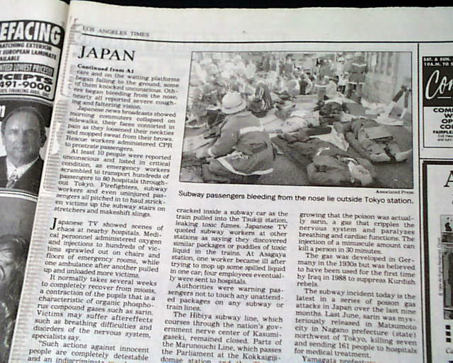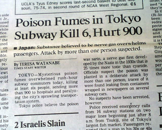 The front page has a two column heading: "Poison Fumes in Tokyo Subway Kill 6, Hurt" with subhead. (see images)