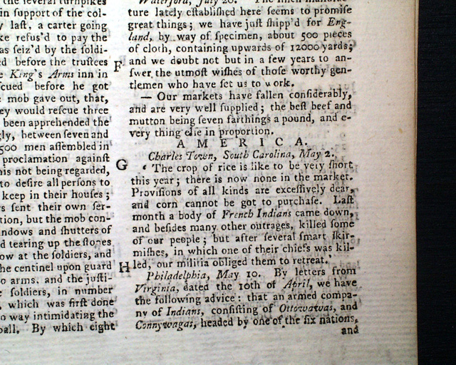 Additional news items from America include a report from Charles Town (Charleston), South Carolina telling of the crops that season, and of the troubles with the French Indians who: "...killed some of our people, but after several smart skirmishes, in which one of their chiefs was killed, our militia obliged them to retreat."