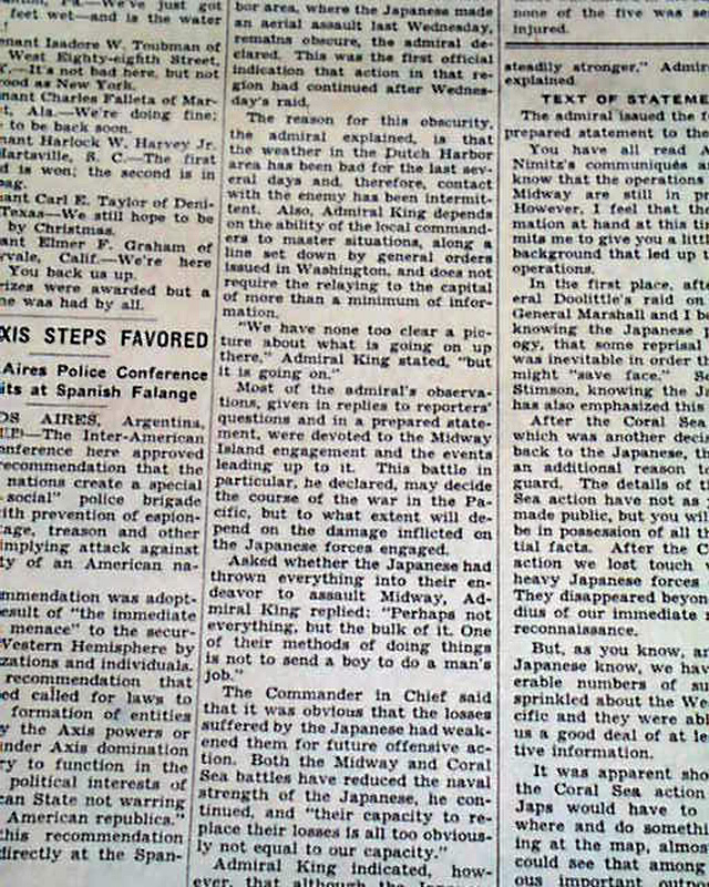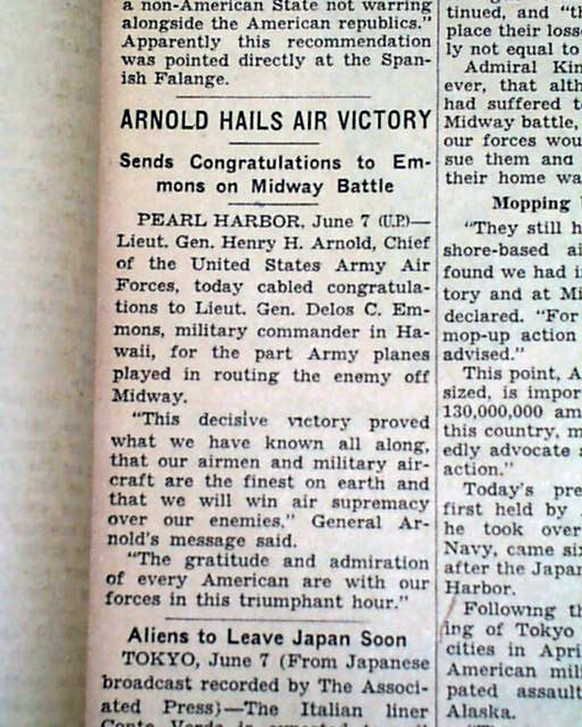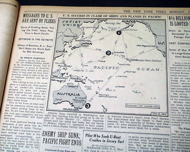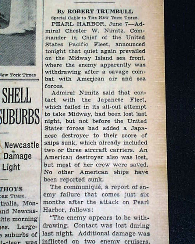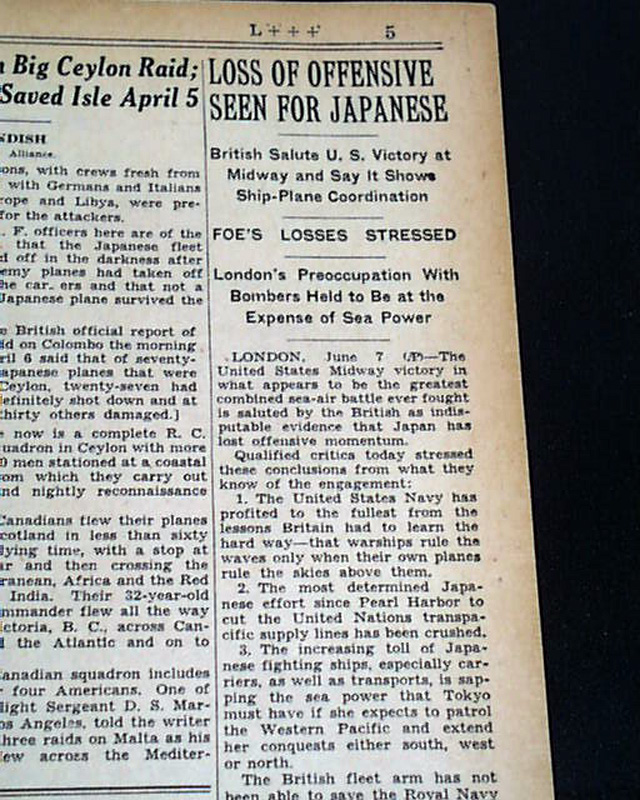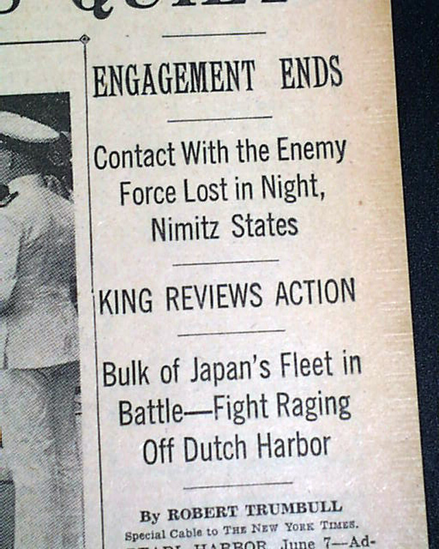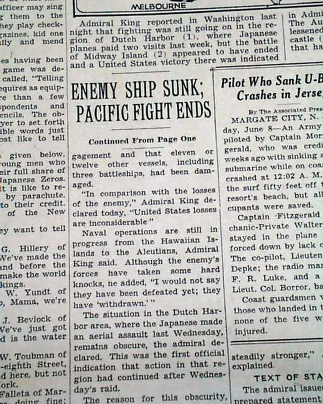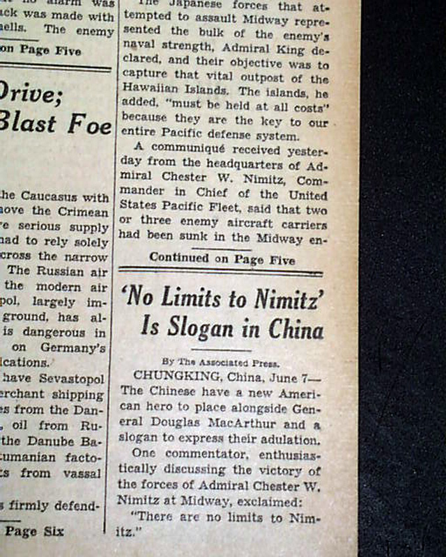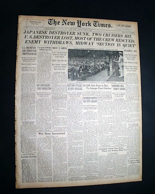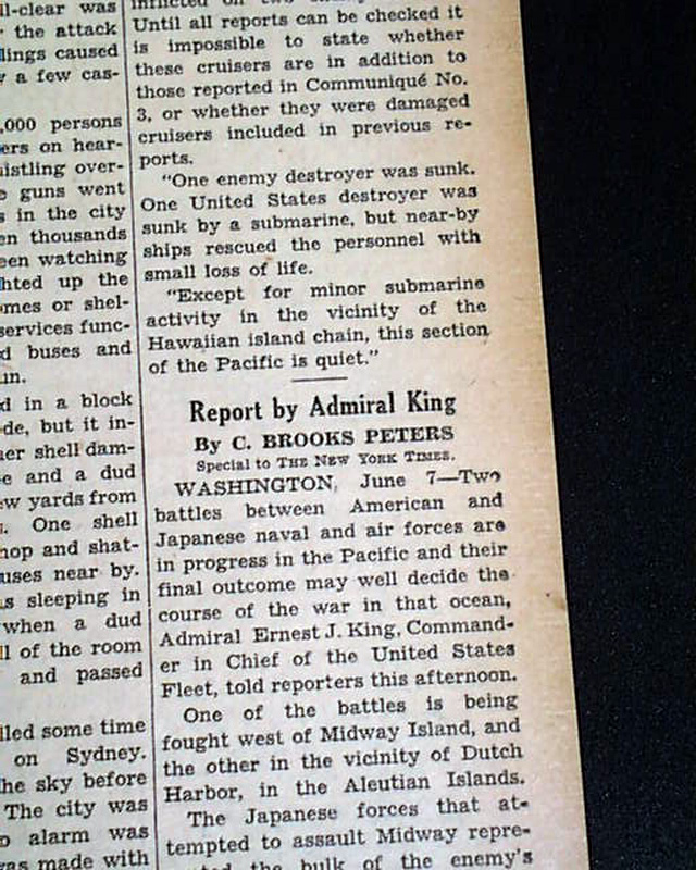 The front page has a nicet three line banner headline: "JAPANESE DESTROYER SUNK, TWO CRUISERS HIT, U.S. DESTROYER LOST, MOST OF THE CREW RESCUED; ENEMY WITHDRAWS, MIDWAY 'SECTION IS QUIET'" with subheads. (see) More on page 5 with related map. Always nice to have notable events in history reported in this World famous publication.