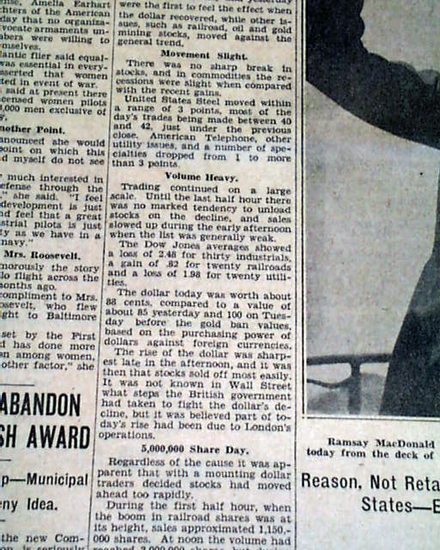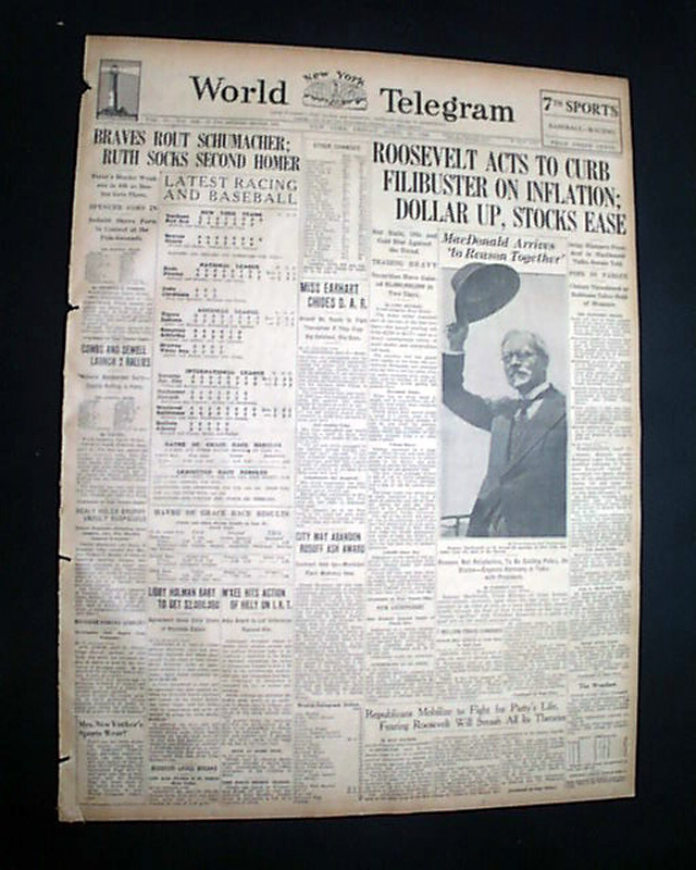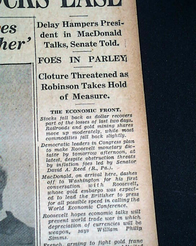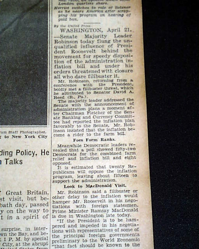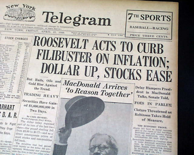 The top of the front page has four column headline: "ROOSEVELT ACTS TO CURB FILIBUSTER ON INFLATION; DOLLAR UP, STOCKS EASE"  with subheads. (see images)