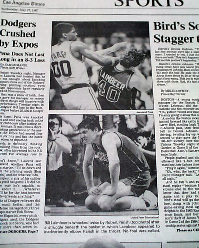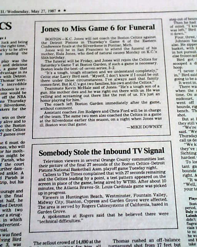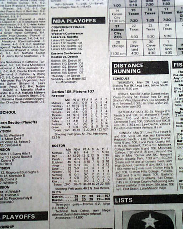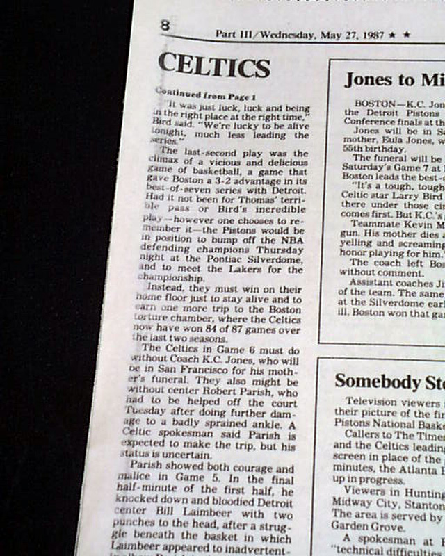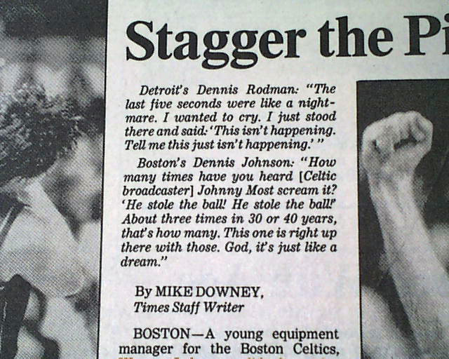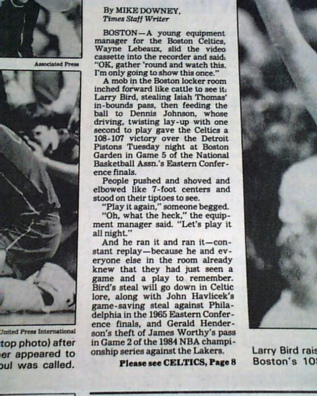 The top of the front page of the sport's section has a heading: "Bird's Soaring Theft, Assist Stagger the Pistons, 108-107" with photo. (see images)