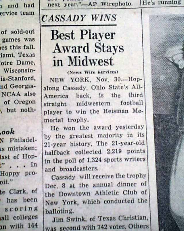 * Howard 'Hopalong' Cassady wins Heisman Trophy