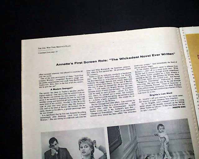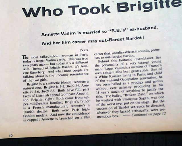 The front page shows a color photo of Danish model and actress Annette Vadim with heading: "The Girl Who's Taken Bardot's Place" and inside editorial with a few more related photos.
