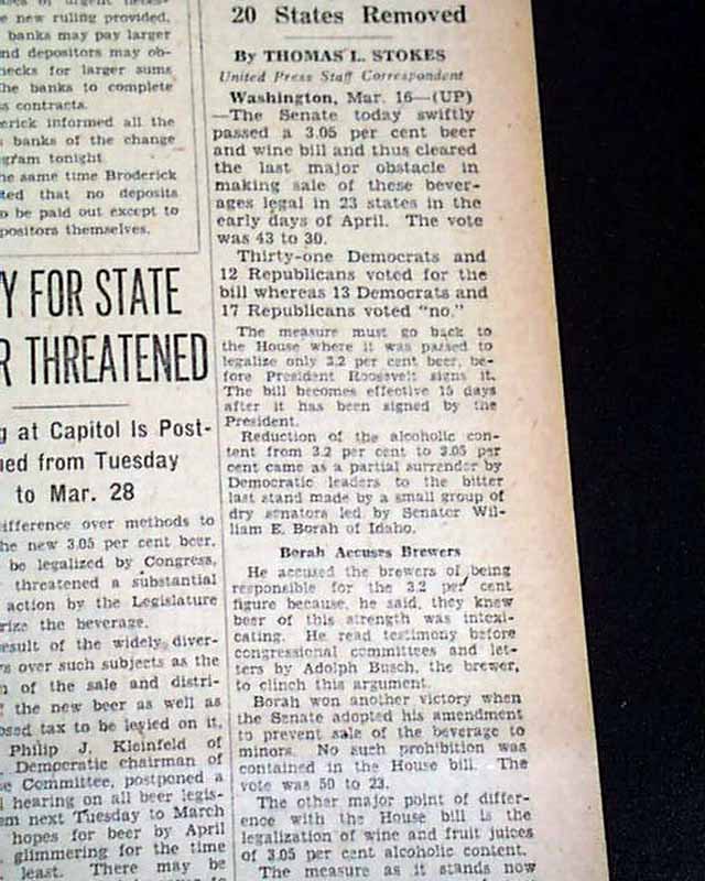The top of the front page has a two column heading: "Senate by 43-30 Votes Beer, Wine Bill of 3.05 Pct." with subheads.
