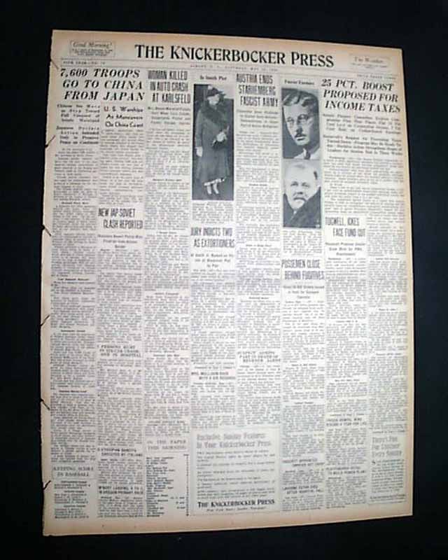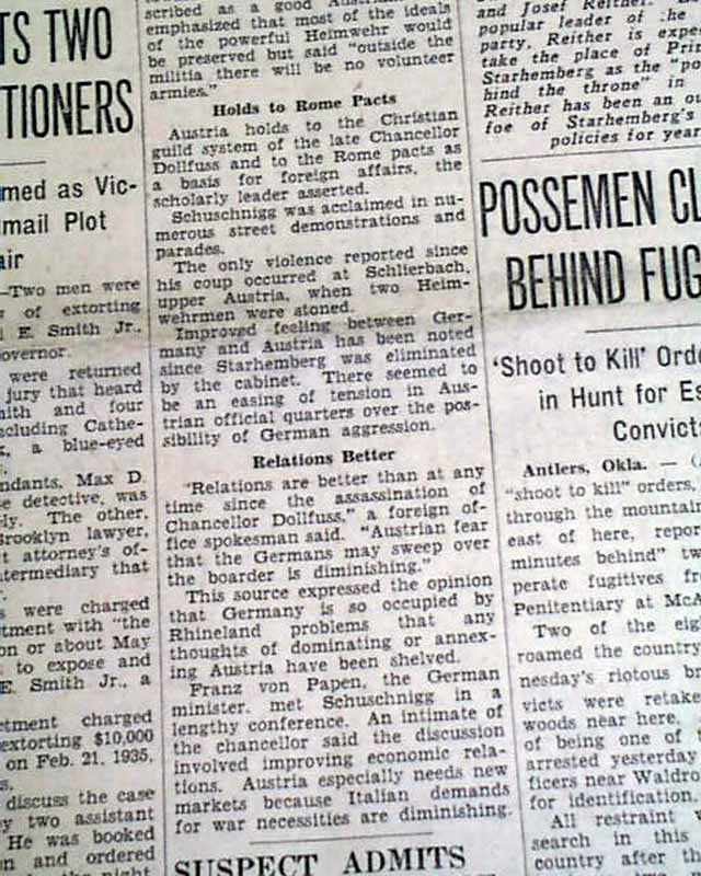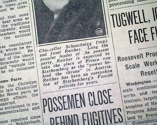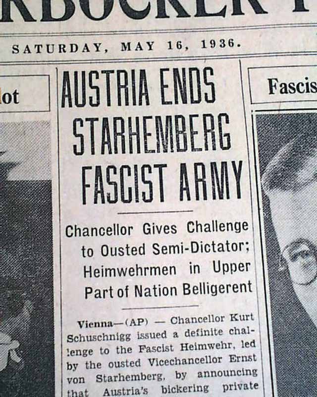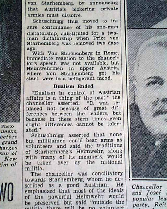 The top of the front page has a one column heading: "AUSTRIA ENDS STARHEIMBERG FASCIST ARMY" with subhead and two related photos. (see images)
