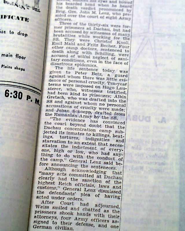 The top of page 11 has a one column heading: "36 DACHAU KILLERS TO DIE BY HANGING" with subhead.