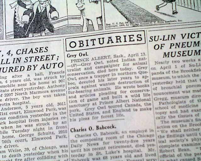Page 16 under "Obituaries" is a tiny heading: "Grey Owl" First report coverage on the death of Grey Owl, widely known for Environmental conservation.
