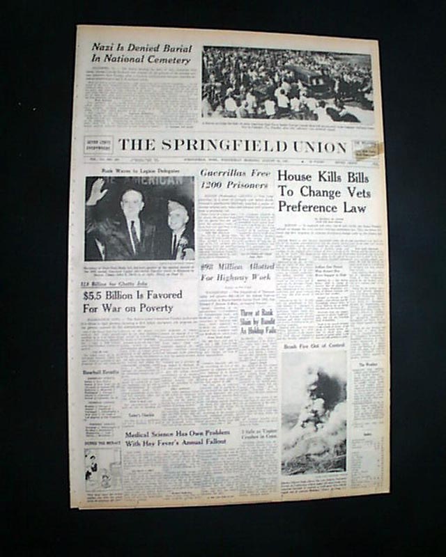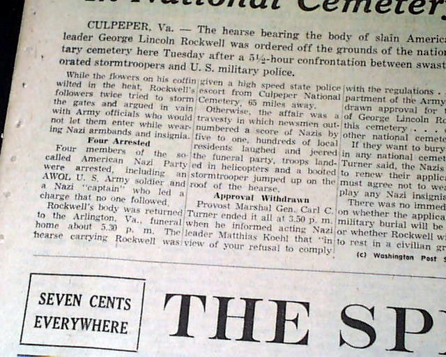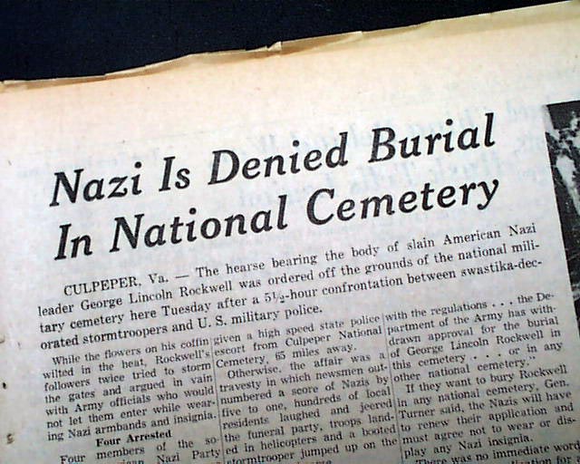 The top of the front page, above the masthead, has a three column heading: "Nazi Is Denied Burial In National Cemetery" with related photo. (see images)
