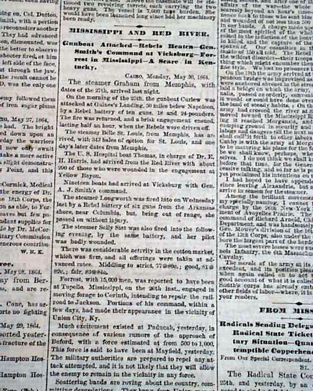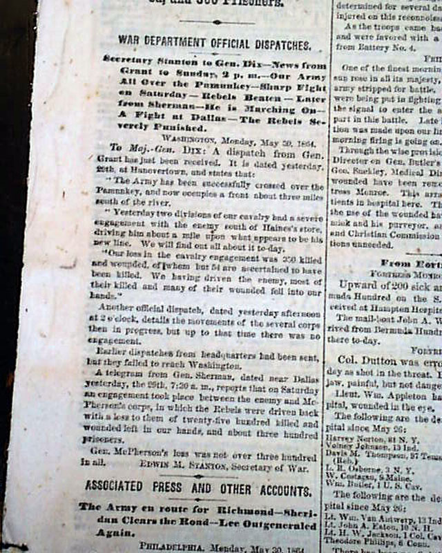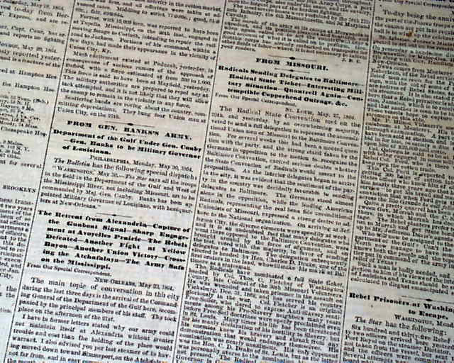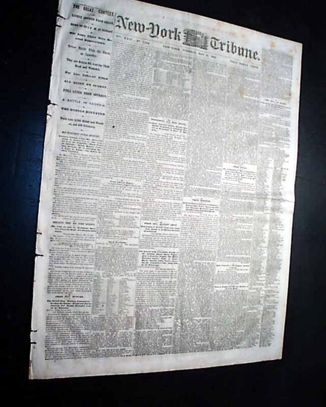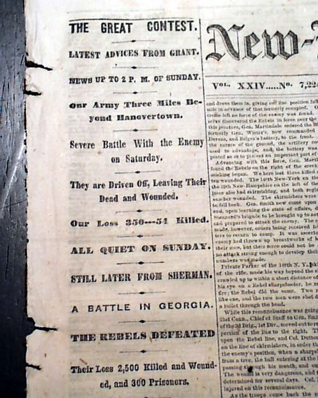 Among the front page one column heads on the Civil War are: "THE GREAT CONTEST" "Latest Advices From Grant", "Severe Battle With the Enemy on Saturday", "Still Later From Sherman", "A Battle In Georgia", "The Rebels Defeated" and more.