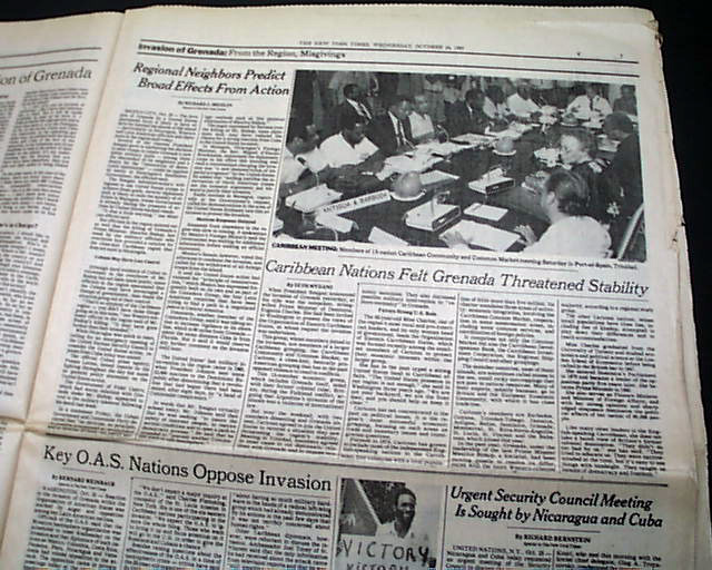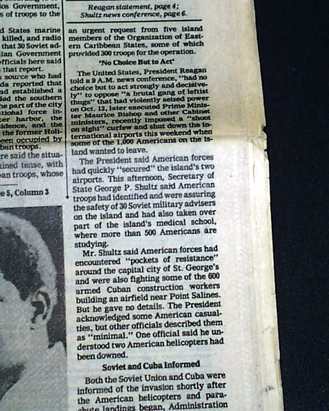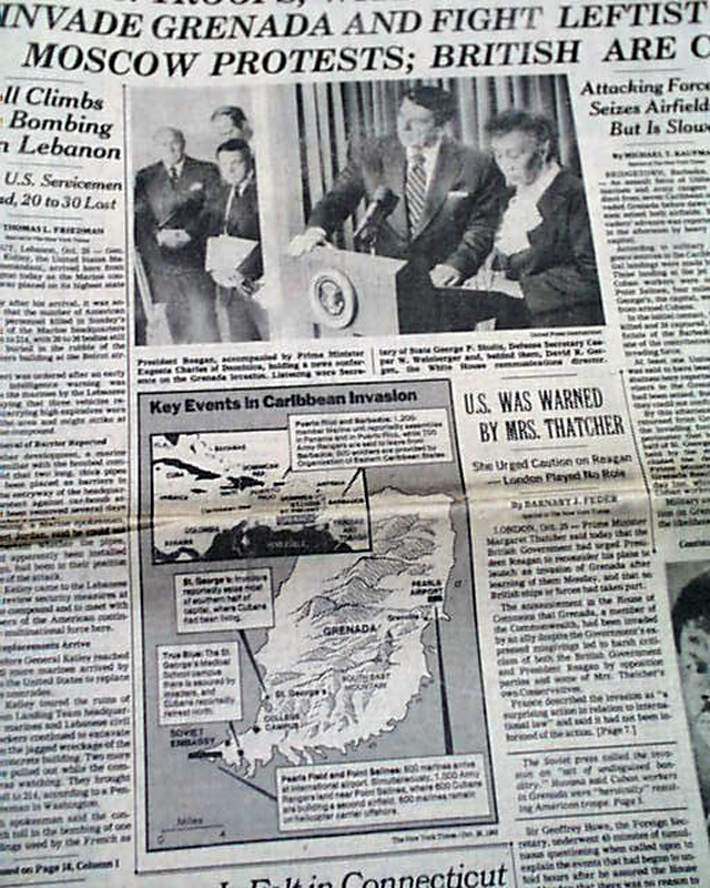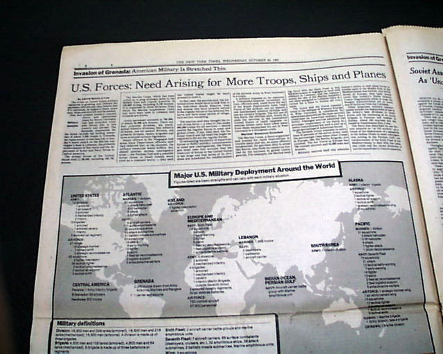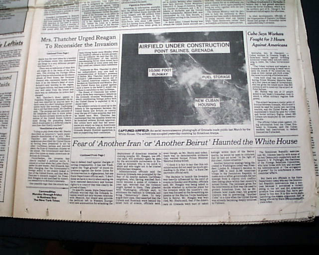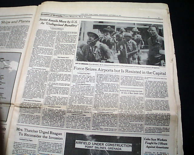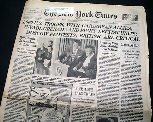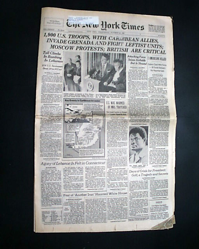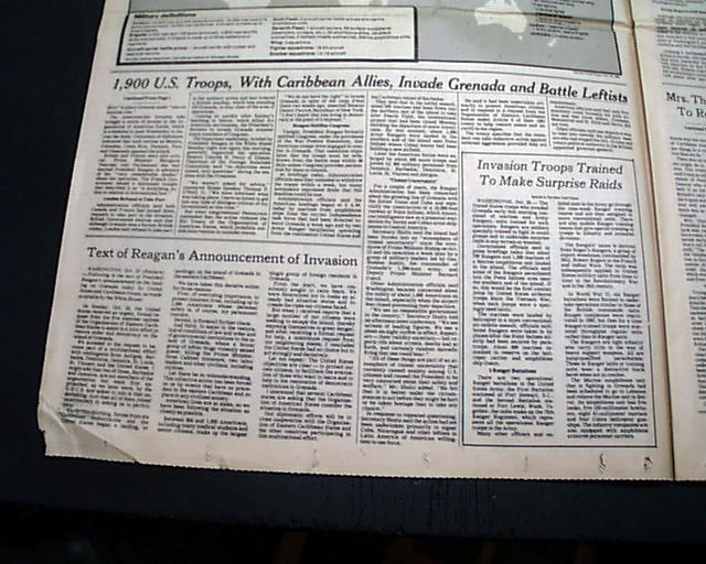 The front page has a banner headline: "1,900 U.S. TROOPS, WITH CARIBBEAN ALLIES, INVADE GRENADA AND FIGHT LEFTIST UNITS; MOSCOW PROTESTS; BRITISH ARE CRITICAL" with subheads, two related photos map. (see images) Nice for display. Much more on the following pages.