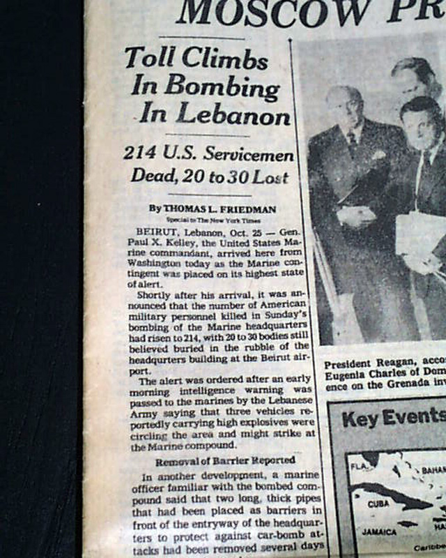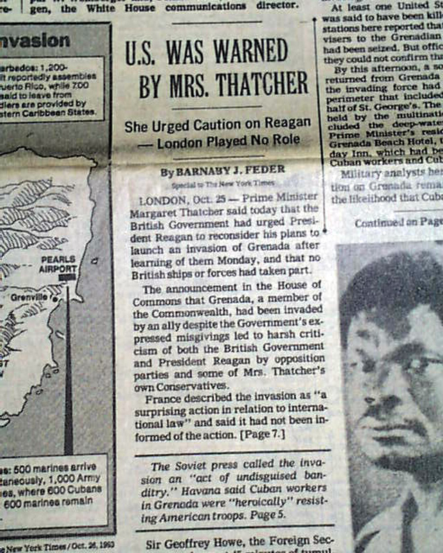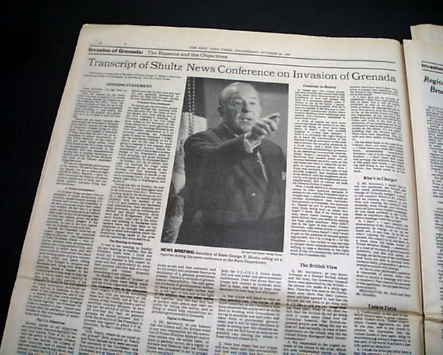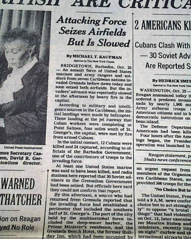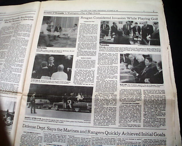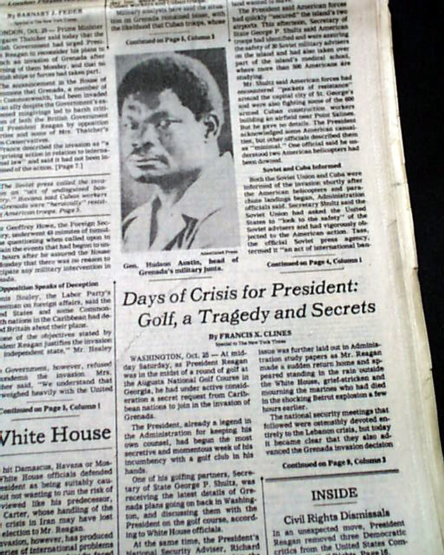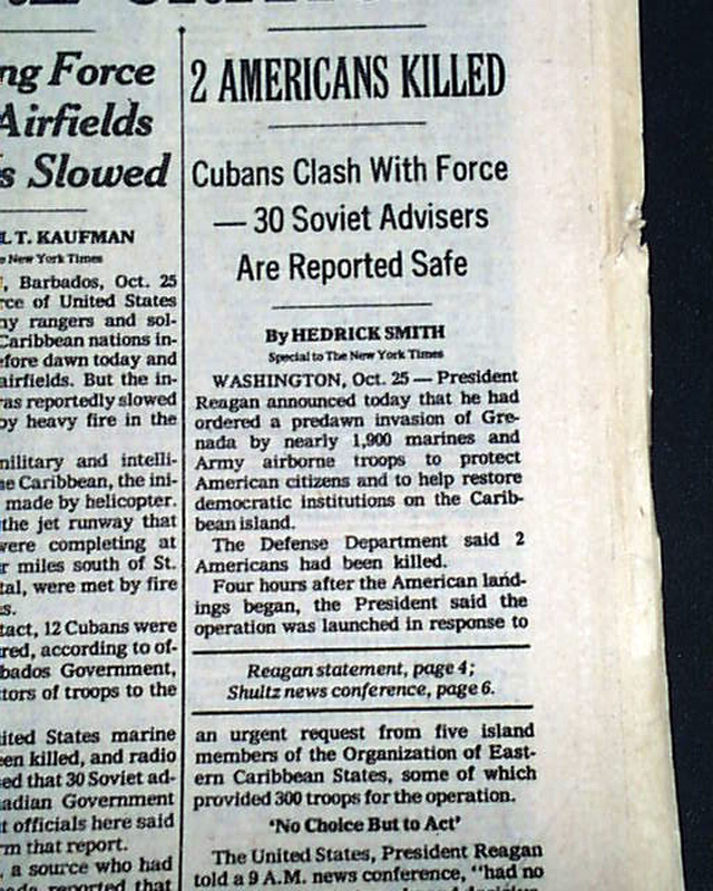 The front page has a banner headline: "1,900 U.S. TROOPS, WITH CARIBBEAN ALLIES, INVADE GRENADA AND FIGHT LEFTIST UNITS; MOSCOW PROTESTS; BRITISH ARE CRITICAL" with subheads, two related photos map. (see images) Nice for display. Much more on the following pages.