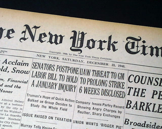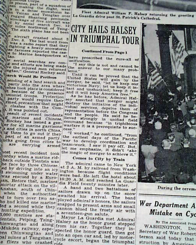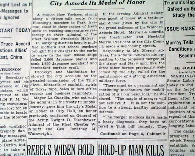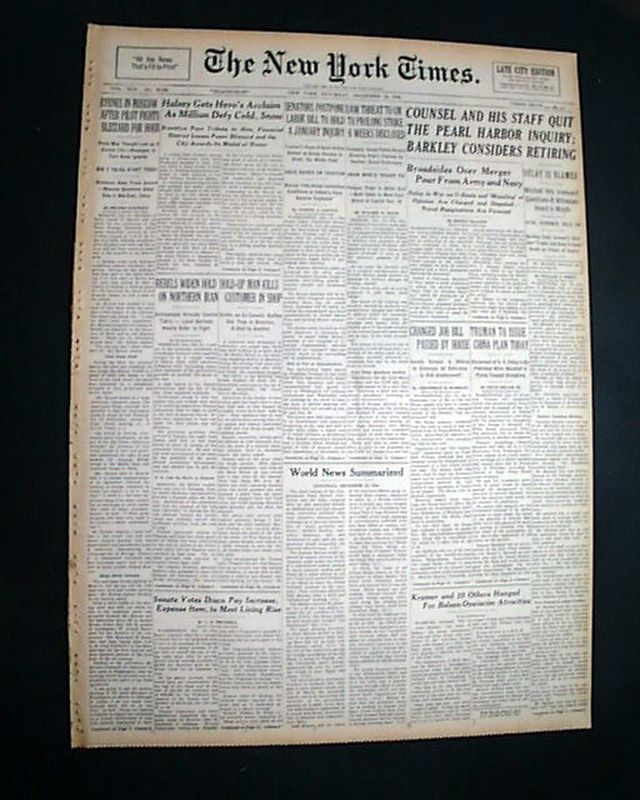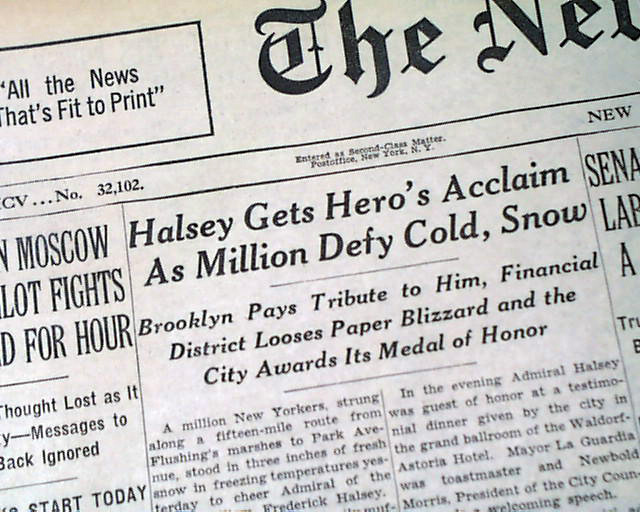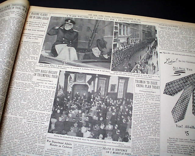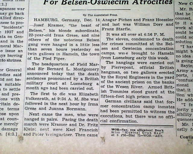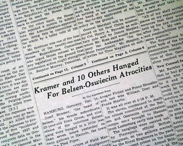 Near the bottom of the front page is a two column heading that reads: "Kramer and 10 Others Hanged For Belsen-Oswiecim Atrocities" (see images) Also a two column headline at the top of the front page: "Halsey Gets Hero's Acclaim As Million defy Cold, Snow" with subhead. (see) Reporting continues on page 3 with related photos. Coverage on the famed Pacific commander, Fleet Admiral William Frederick Halsey, Jr.'s welcome home ticker tape parade in New York City. Always nice to have notable events in history reported in this World famous publication.