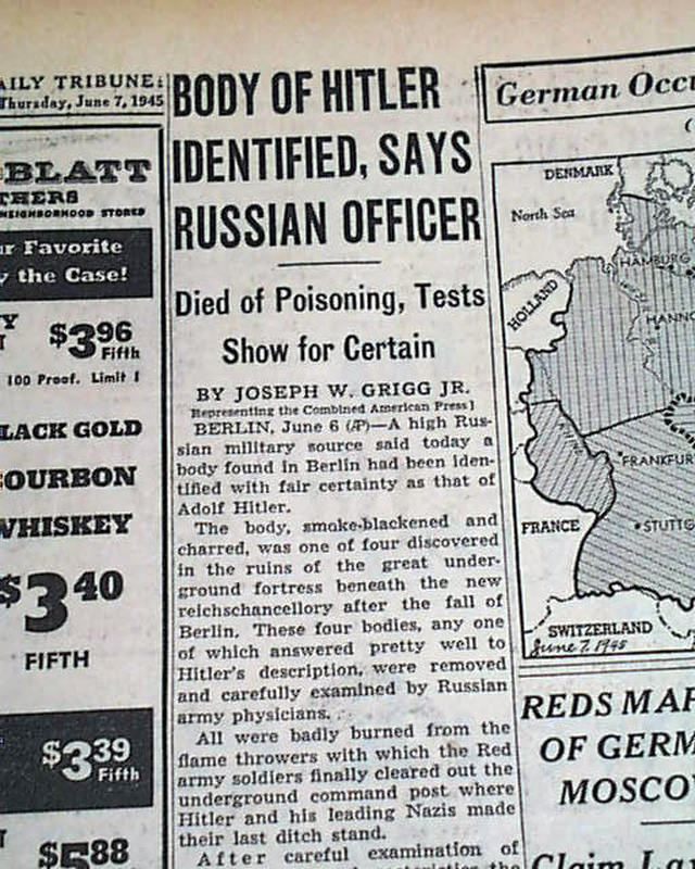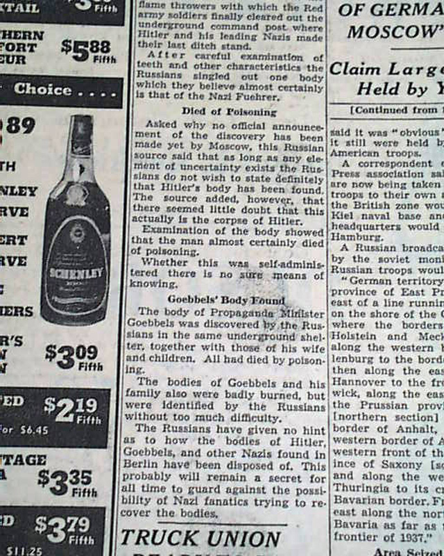 The top of page 10 has a one column heading: "BODY OF HITLER IDENTIFIED, SAYS RUSSIAN OFFICER" with subhead. (see images) Official report from the Russian military on the death of Adolph Hitler. There was always speculation on how he died and what happened to his body. This may be the only proof of what really took place those last few days in Berlin, Germany.
