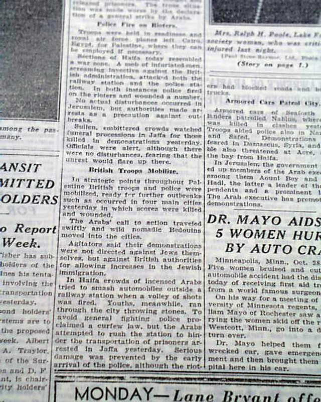 The top of page 3 has a one column heading: "BRITISH MOBILIZE TROOPS AS ARAB RIOTING SPREADS" with subhead. (see images) First report coverage on the 1933 Palestine riots during the intercommunal conflict in Mandatory Palestine.