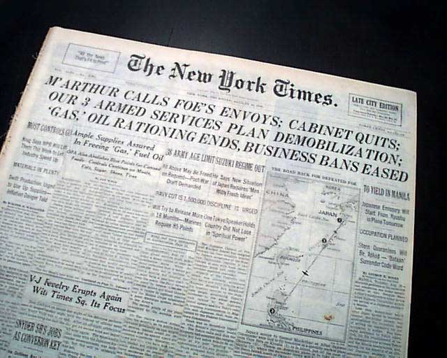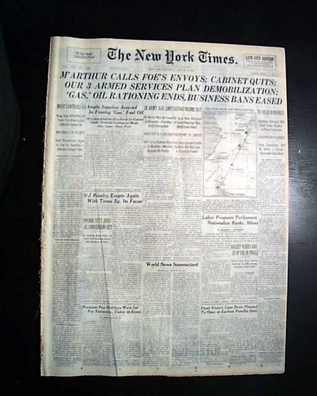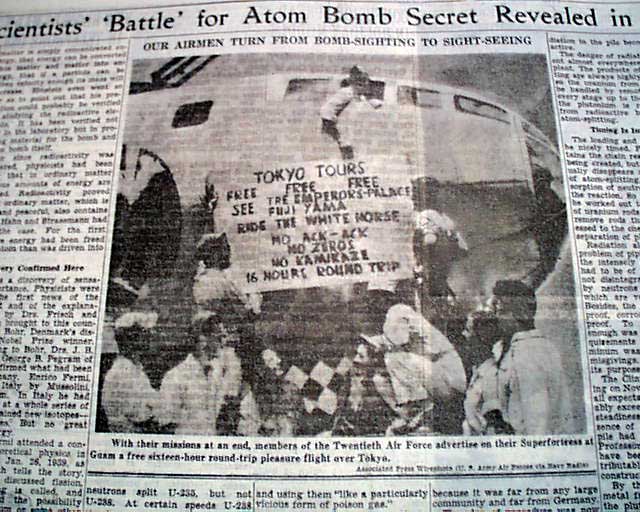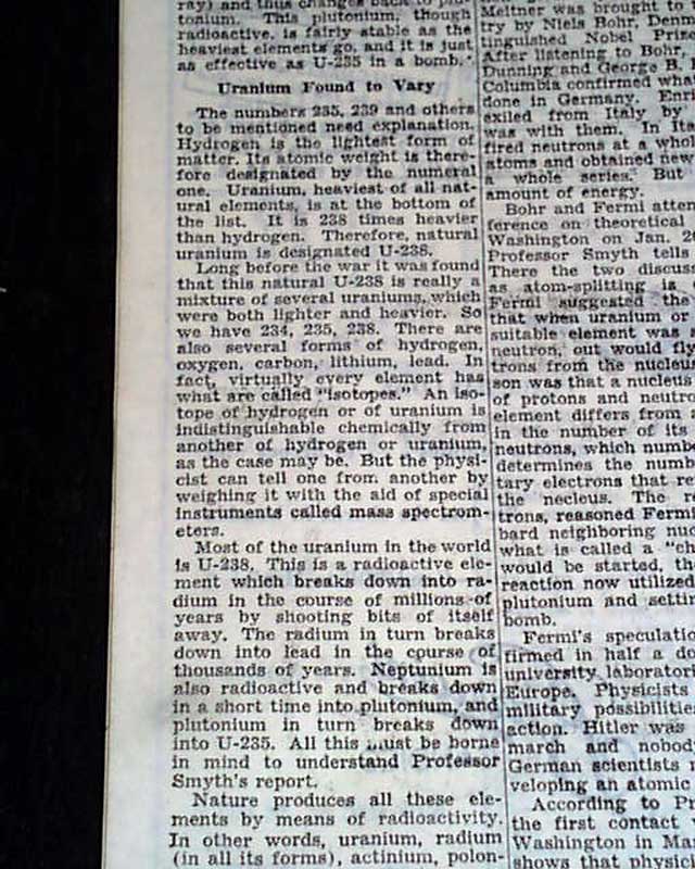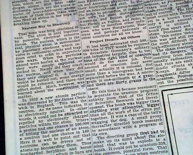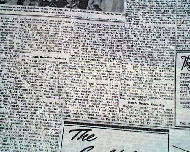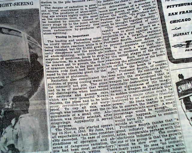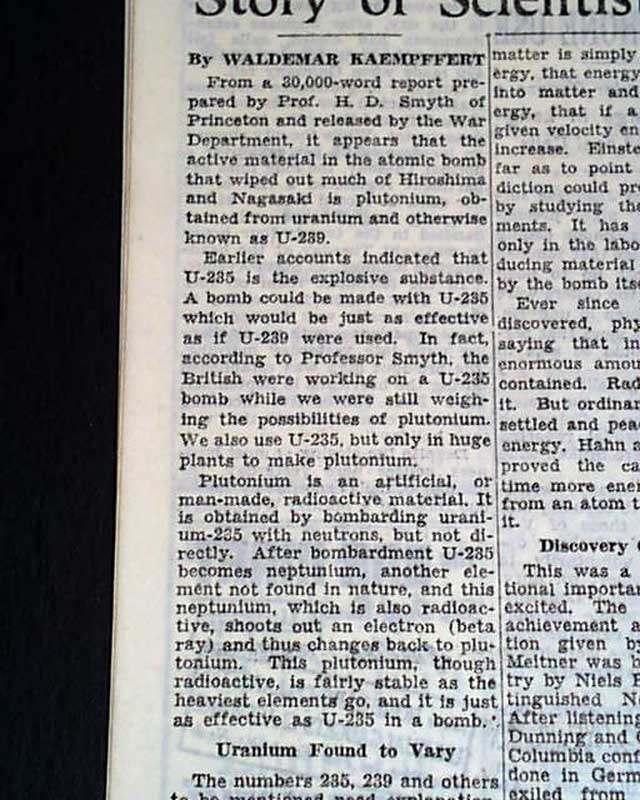 The top of page 8 has a seven column heading: "Story of Scientists' 'Battle' for Atom Bomb Secret Revealed in Smyth Report" with smaller subheads and related photo. See images for portion of the report. This was when the "Smyth Report" was 1st made public, making it a historic report here. Hiroshima and Nagasaki where bombed just over a week earlier.