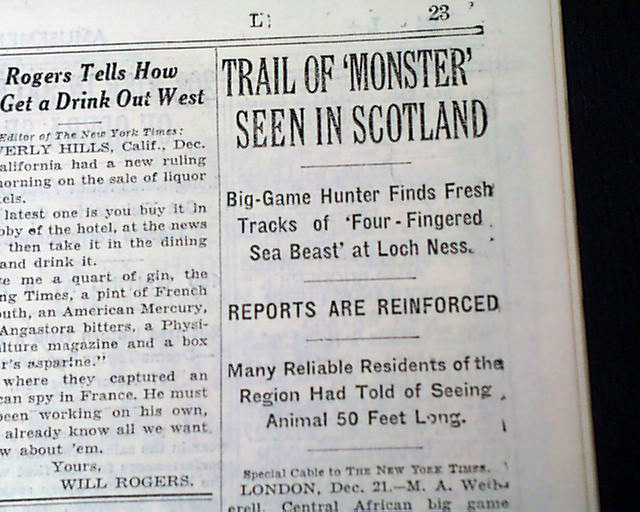 The top of page 23 has a one column heading: "TRAIL OF 'MONSTER' SEEN IN SCOTLAND" with subheads. (see images)