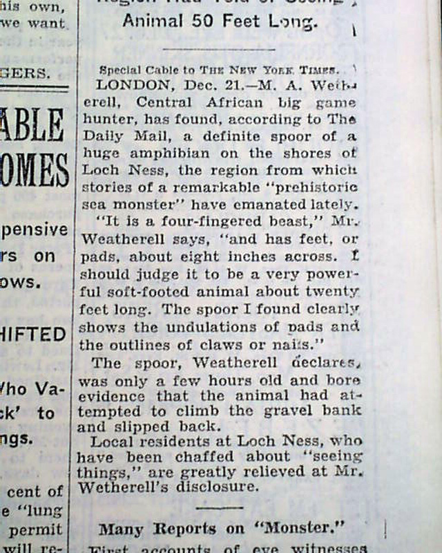 AI notes: On December 21, 1933, the Daily Mail published a report by big-game hunter M. A. Wetherell claiming to have discovered “definite spoor” of a large creature on the south shore of Loch Ness, describing four-toed footprints with pads about eight inches across, suggesting a powerful, soft-footed animal roughly 20 feet long. The newspaper sensationalized the find with headlines proclaiming that the Loch Ness Monster was “not a legend but a fact,” fueling international fascination. Wetherell’s plaster casts were later examined by the Natural History Museum in London, which concluded they were not from any unknown animal but rather a hippopotamus foot, likely a novelty item used as a prop, revealing the tracks as a hoax or misidentification. Despite this, the December 1933 sightings marked the beginning of the modern Loch Ness phenomenon, transitioning the creature from obscure folklore to a worldwide media sensation, and illustrating how early “evidence” for Nessie was largely based on sensationalized, unverified claims.
