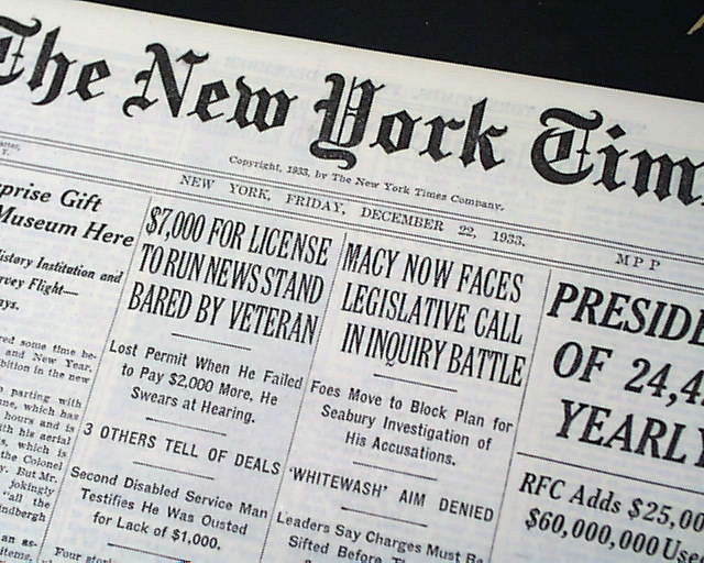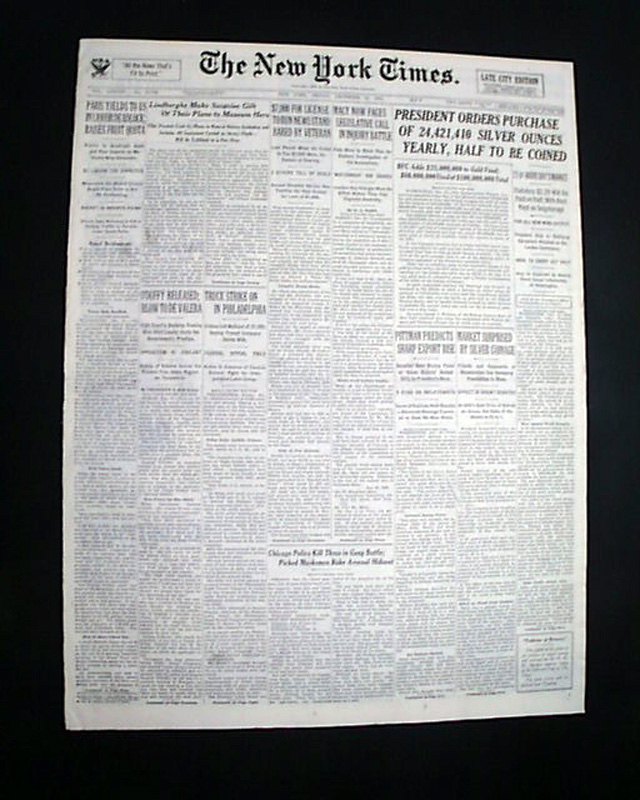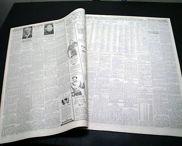 And near the bottom of the front page is a two column headings that reads: "Chicago Police Kill Three in Gang Battle; Picked Marksmen Rake Arsenal Hideout" First report coverage on the police raid upon a Dillinger hideout in which 3 of his gang members were killed. Dillinger had supposedly escape. This was during his early bank robberies across the Midwest. Rare to find reports on him prior to 1934 before becoming a household name.