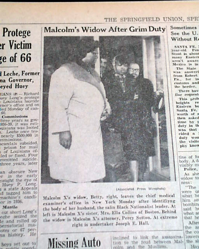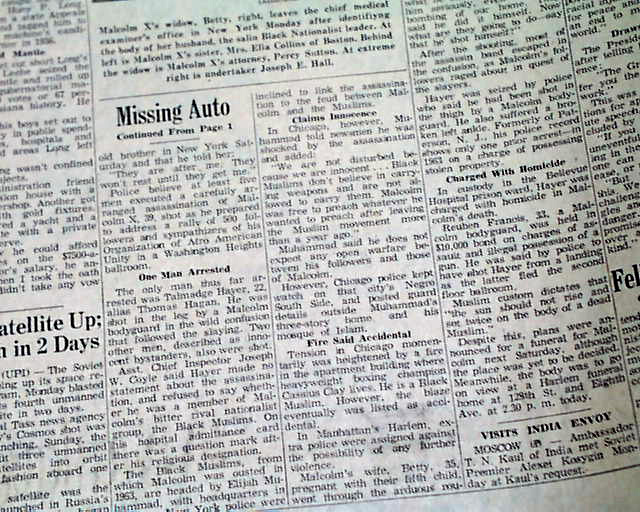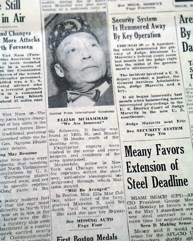 The front page has a one column heading: "Missing Auto Of Malcolm X Is Loacated" with subhead and photo of Elijah Muhammad. (see images)