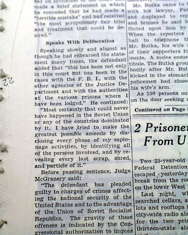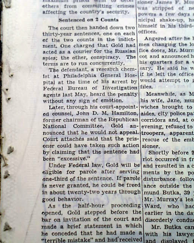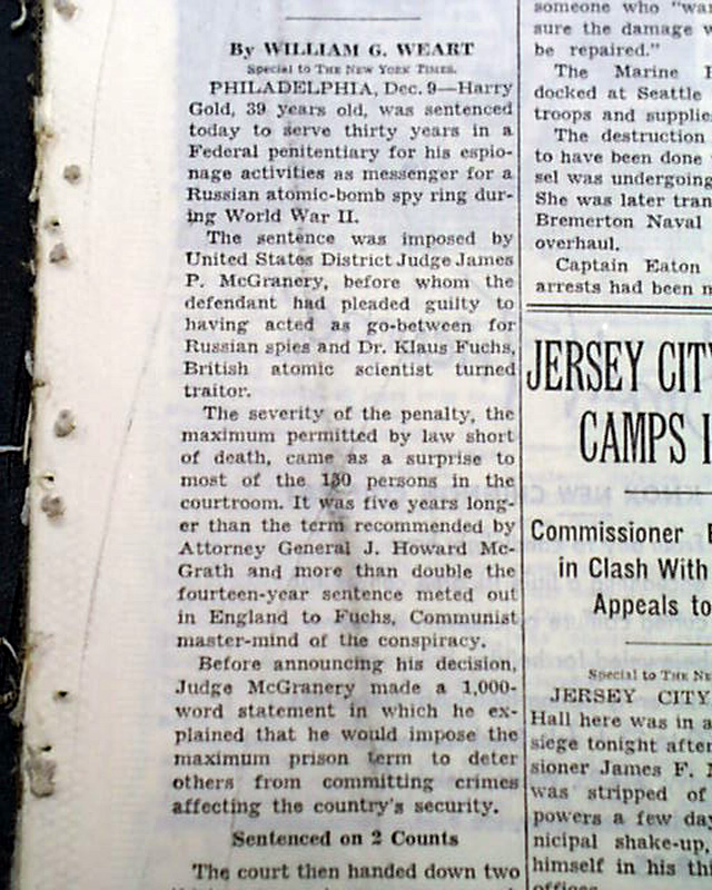The top of the front page has a one column heading: "GOLD, ATOM SPY, GETS 30-YEAR MAXIMUM FOR AIDING RED WING" with subheads. (see images)